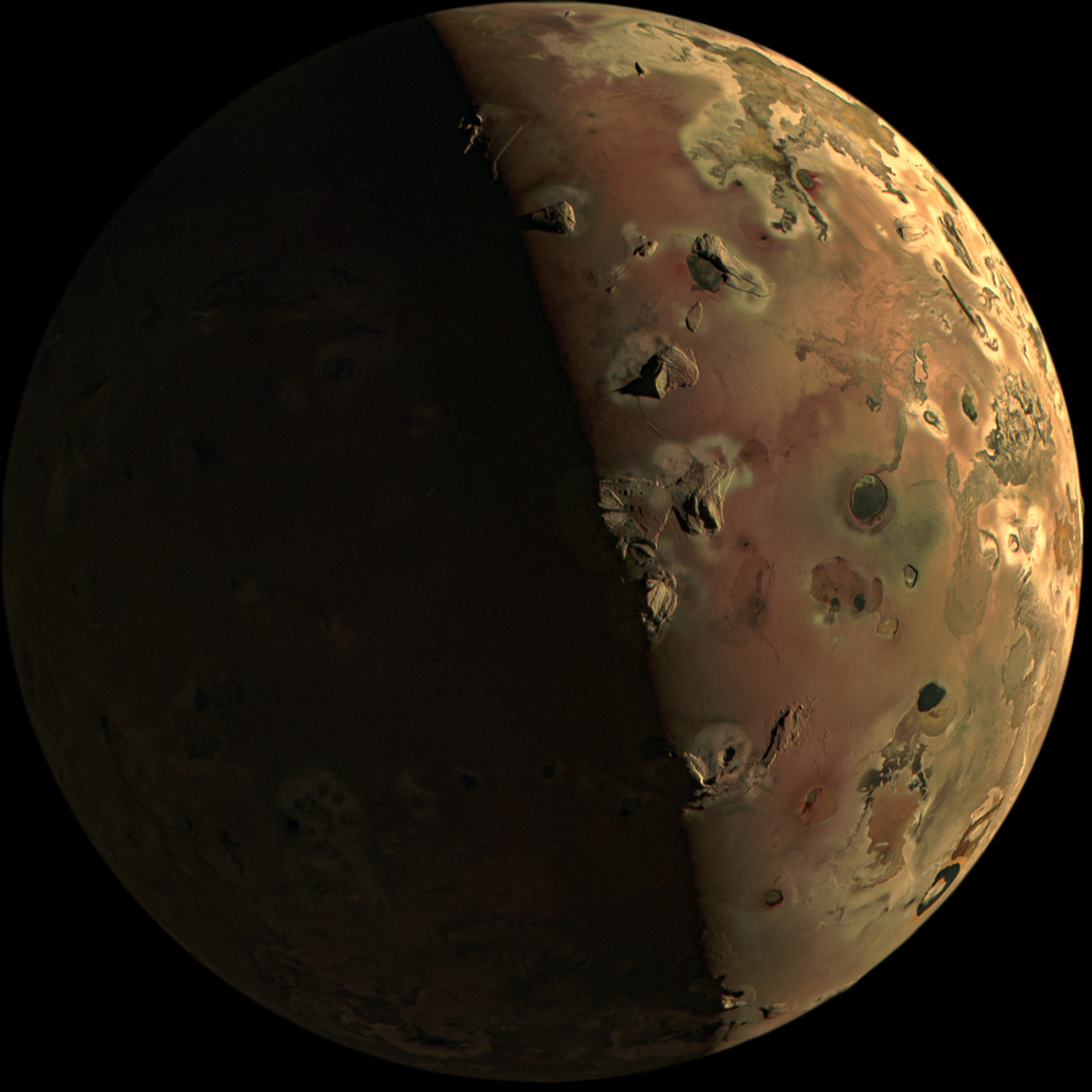 Processed using the JunoCam imager's PJ57 Io raw images and data from NASA's Juno spacecraft flyby on December 30, 2023. Enhanced to highlight features, colours, and the beauty of Jupiter's moon Io. Artist's impression - not representative of true colour.