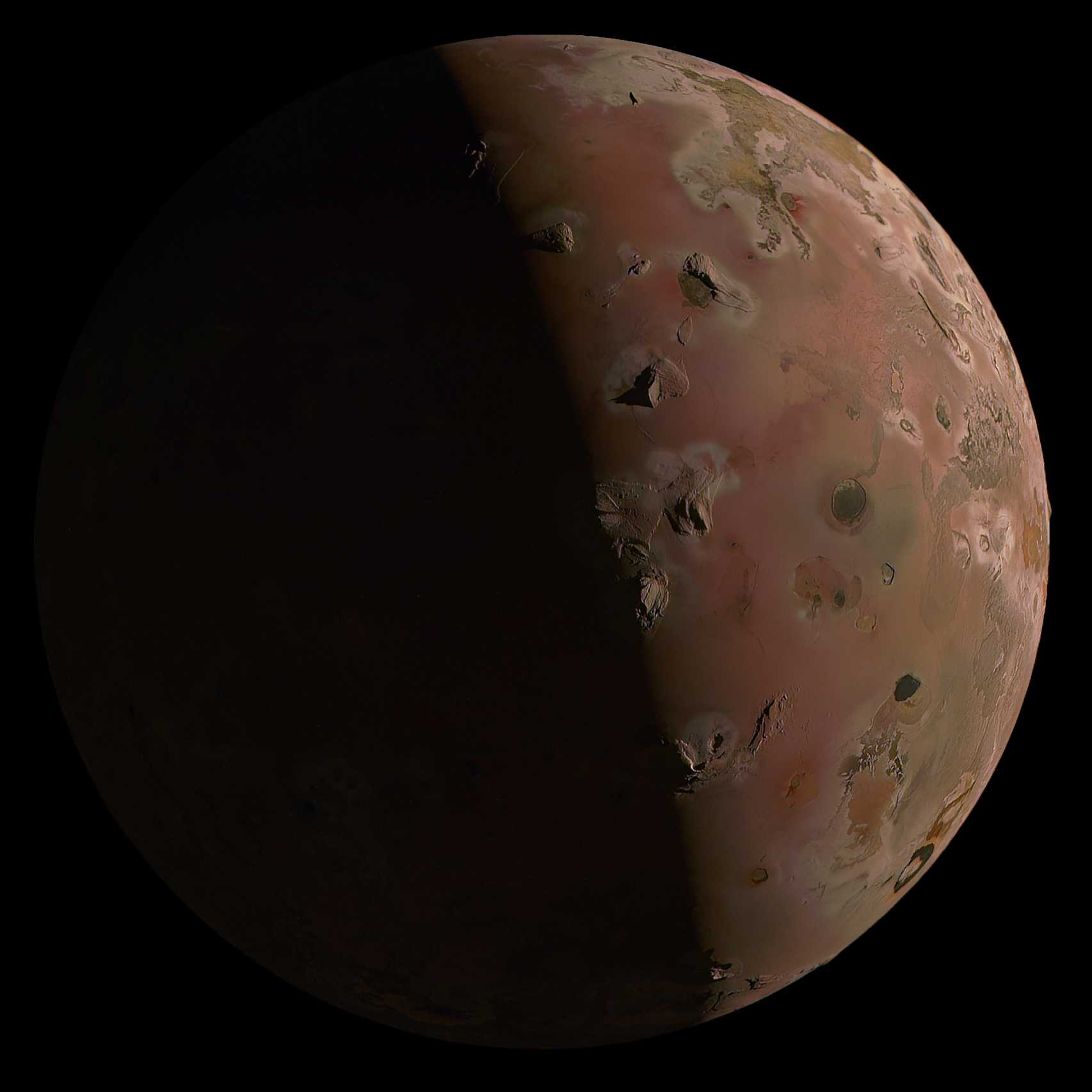 This one is probably the best image of Io ever taken and has many stunning surface features. I can't help myself not to dive into these details in the image taken by the Juno spacecraft. Mountains, craters, volcanic vents, pools and solidified flows of lava. Impressive details!