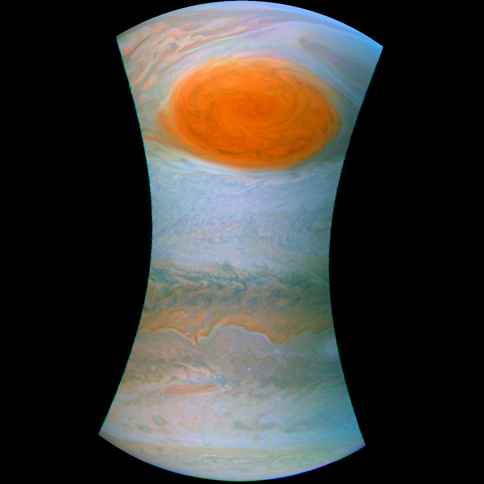 Edited raw image from Juno observation of GRS. Basic editing using free pixlr service. Edit dealt with colour vibrance, brightness and contrast, hue and saturation and one or two other minor edits.
