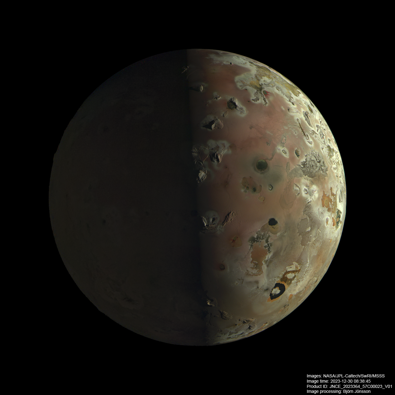 Image 23 of Io obtained by JunoCam on December 30, 2023. North is up. The color balance is preliminary but hopefully this is not very far from Io's real color. The brightness of the nightside has been increased to show details there illuminated by Jupitershine.