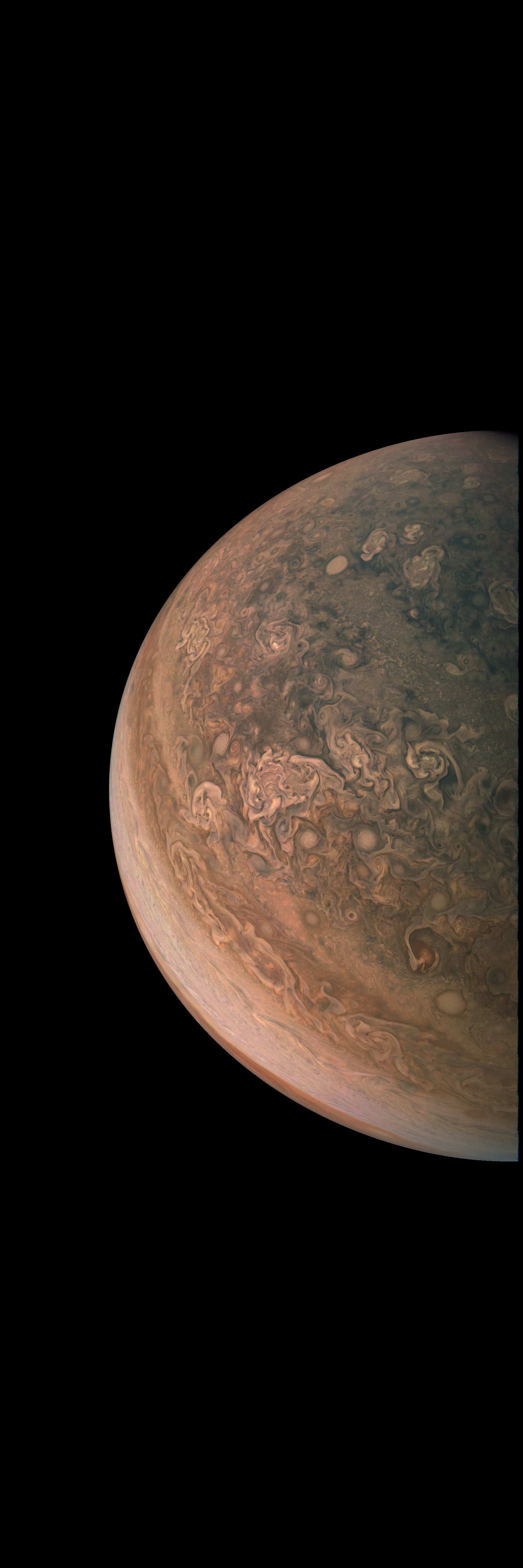 Junocam pixels are 12 bits deep from the camera but are converted to 8 bits inside the instrument using a lossless "companding" table, a process similar to gamma correction, to reduce their size. All Junocam products on the missionjuno website are in this 8-bit form as received on Earth. Scientific users interested in radiometric analysis should use the "RDR" data products archived with the Planetary Data System, which have been converted back to a linear 12-bit scale.