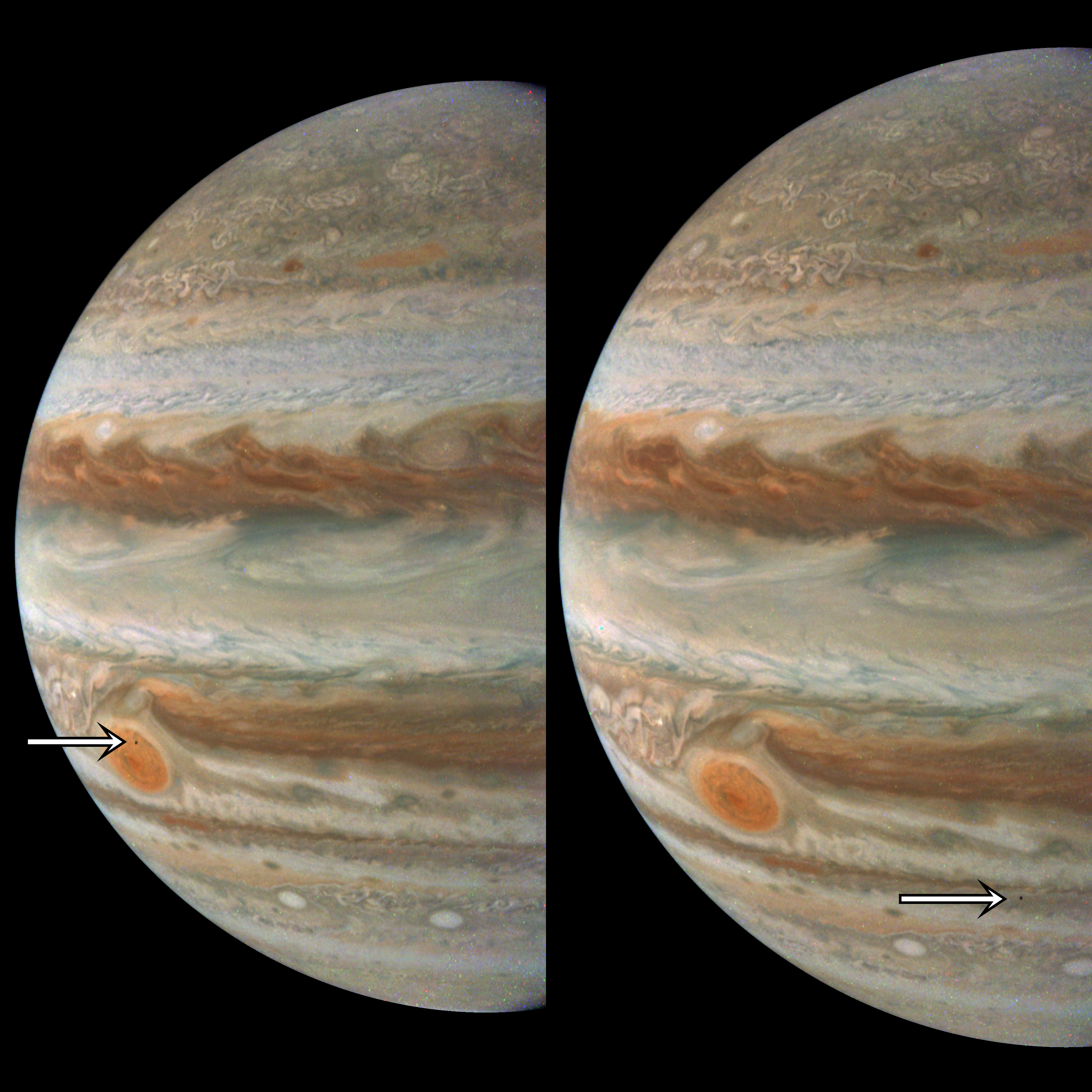 Resolution is 120 pixels per degrees in an equidistant cylindrical system centered to the camera at image stop time, with an axis parallel to Juno's spin axis. The images are a cropped from images with a rendered field of view of 60x30 degrees and cover about 15x30 degrees, each.