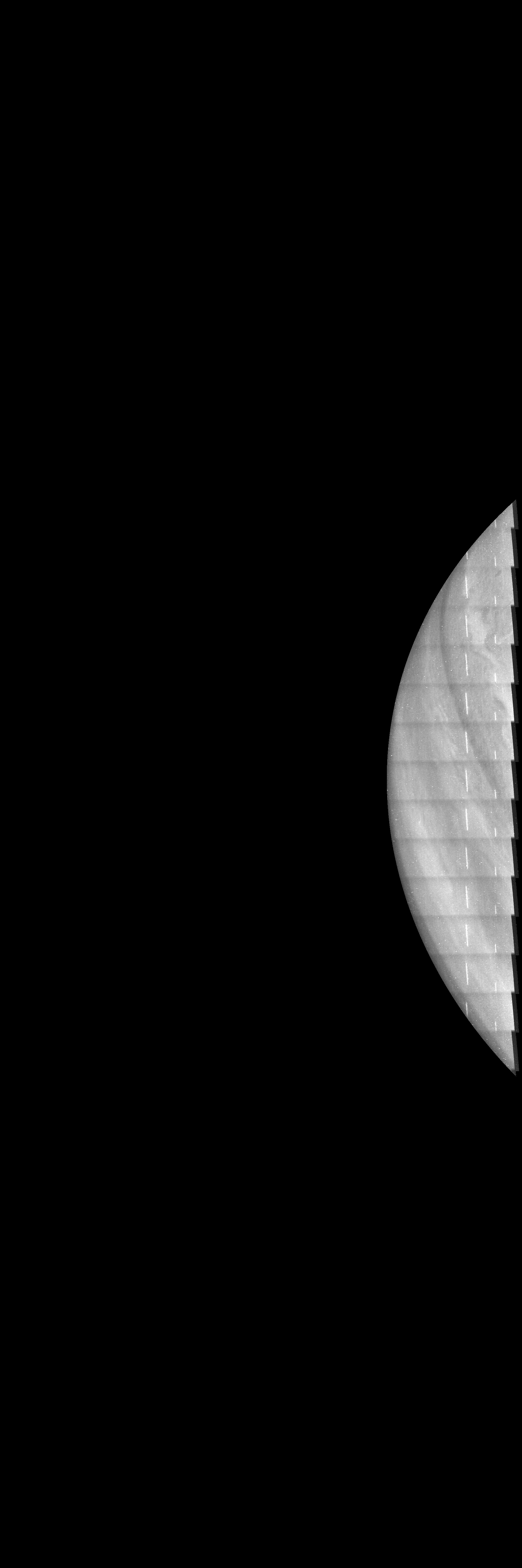 This methane-band image is reprojected according to a preliminary geometrical camera model, cleaned from some of the camera artifacts and energetic particle hits, approximately illumination adjusted with a 3rd degree polynomial BRDF over the cosines of the incidence and emission angle on the basis of PJ50 images, and displayed with gamma = 1 with respect to the square root of radiometric values.