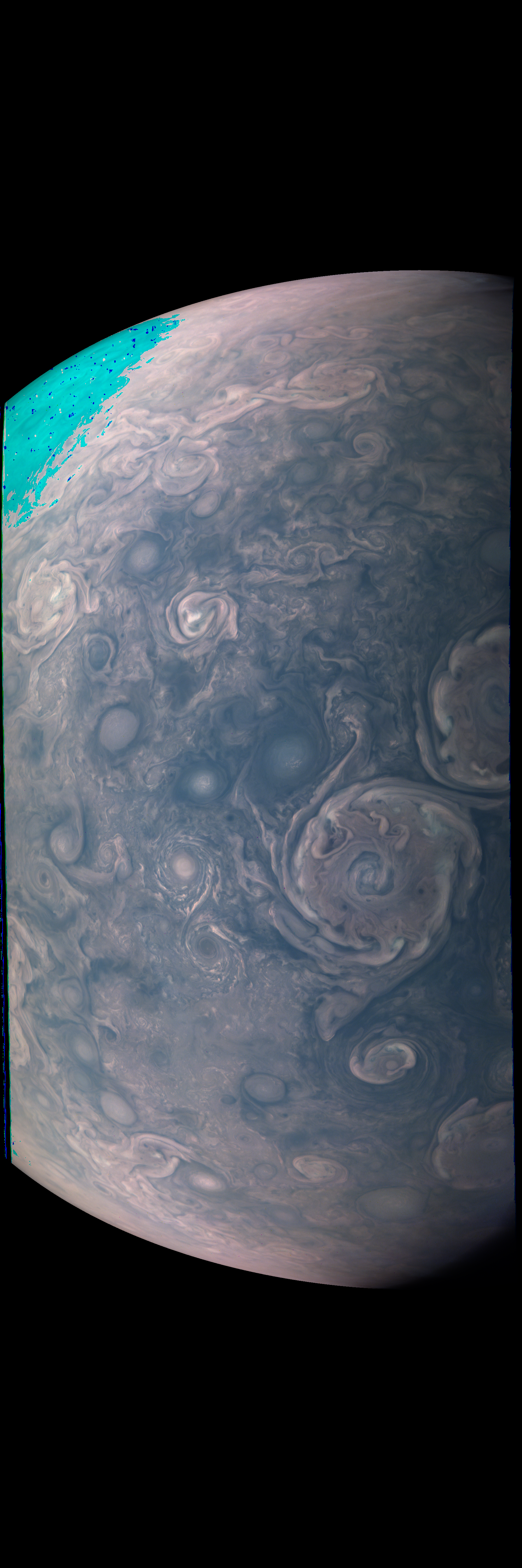 The image is reprojected according to a preliminary geometrical camera model, cleaned from some of the camera artifacts, approximately illumination adjusted with a 3rd degree polynomial BRDF over the cosines of the incidence and emission angle on the basis of PJ50 images, linearized to radiometric values, white-balanced with linear factors (0.629;1.0;3.65) for (R;G;B) on the basis of inbound PJ63 JunoCam images, and displayed with gamma=2 with respect to the square root of radiometric values.
