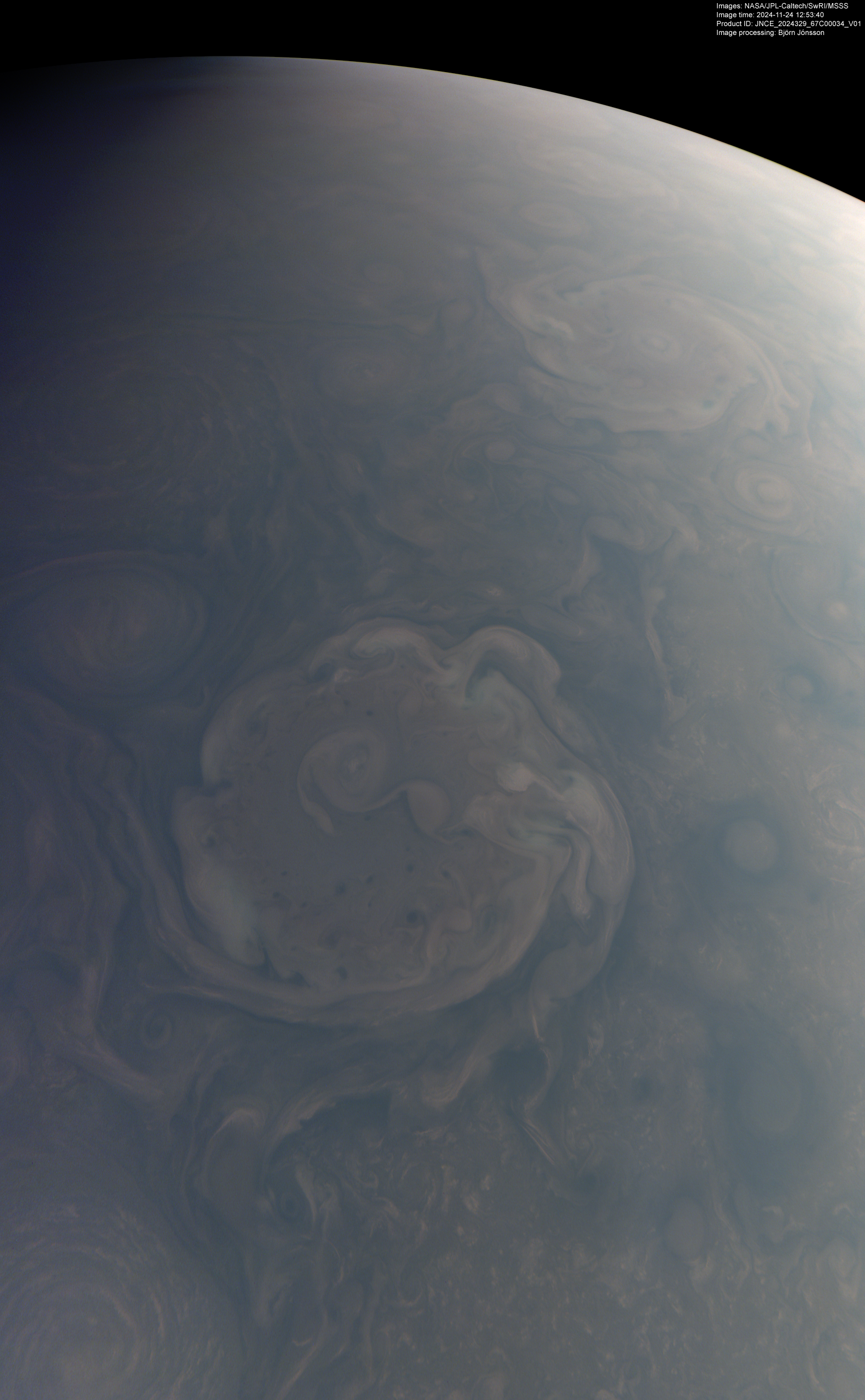 An approximately true color/contrast image processed from the PJ67_34 raw image framelets. The area near the terminator has been brightened a bit. The central north polar cyclone is visible above center at left. North is up.