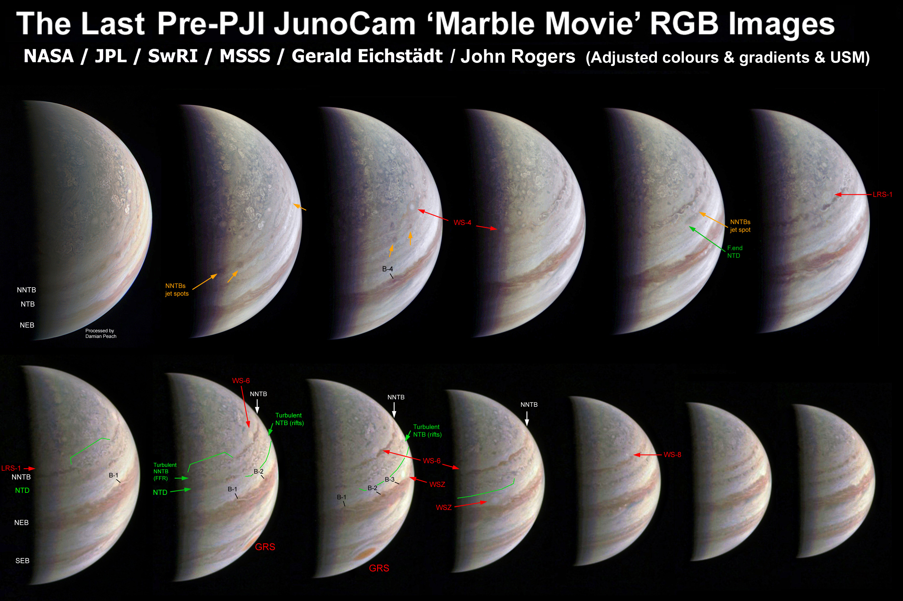 Before and after its first perijove on Aug.27, Juno’s camera was taking frequent shots of the whole planet, nicknamed ‘marble movies’, with very useful resolution. Gerald Eichstädt has kindly provided processed versions of all the raw images. In this and the following compilation, I have further enhanced a selection of them, and identified the features which we were following in amateur images. This compilation shows the northern hemisphere, for a whole rotation in the day before perijove.