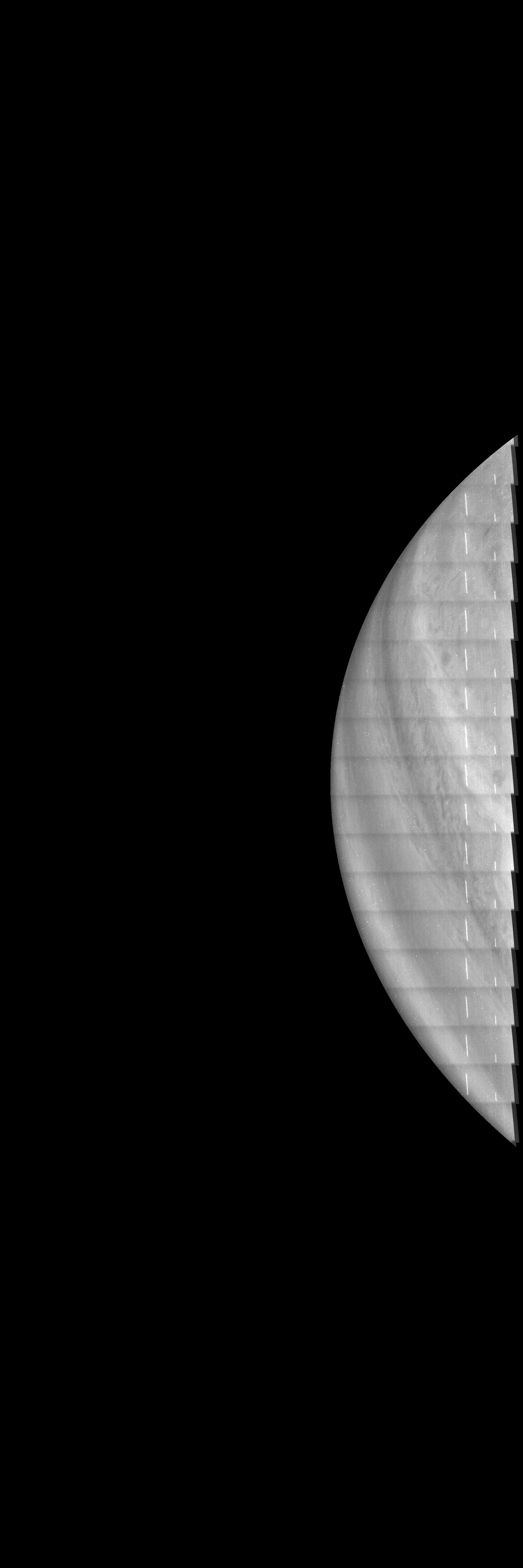 This methane-band image is reprojected according to a preliminary geometrical camera model, cleaned from some of the camera artifacts and energetic particle hits, approximately illumination adjusted with a 3rd degree polynomial BRDF over the cosines of the incidence and emission angle on the basis of PJ50 images, and displayed with gamma=1 with respect to the square root of radiometric values.