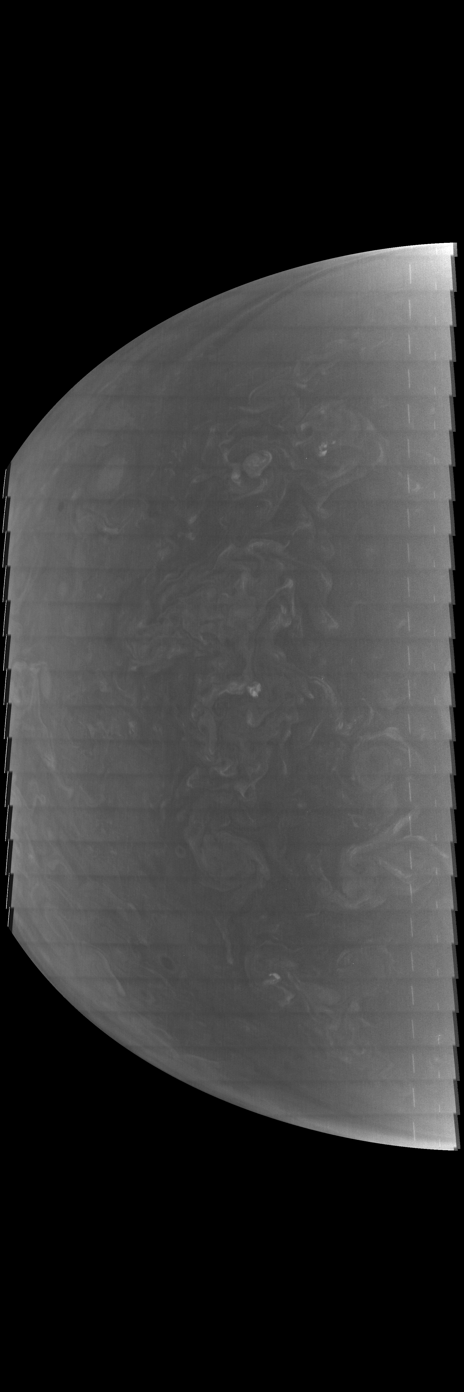 This methane-band image is reprojected according to a preliminary geometrical camera model, cleaned from some of the camera artifacts and energetic particle hits, approximately illumination adjusted with a 3rd degree polynomial BRDF over the cosines of the incidence and emission angle on the basis of PJ50 images, and displayed with gamma=1 with respect to the square root of radiometric values.