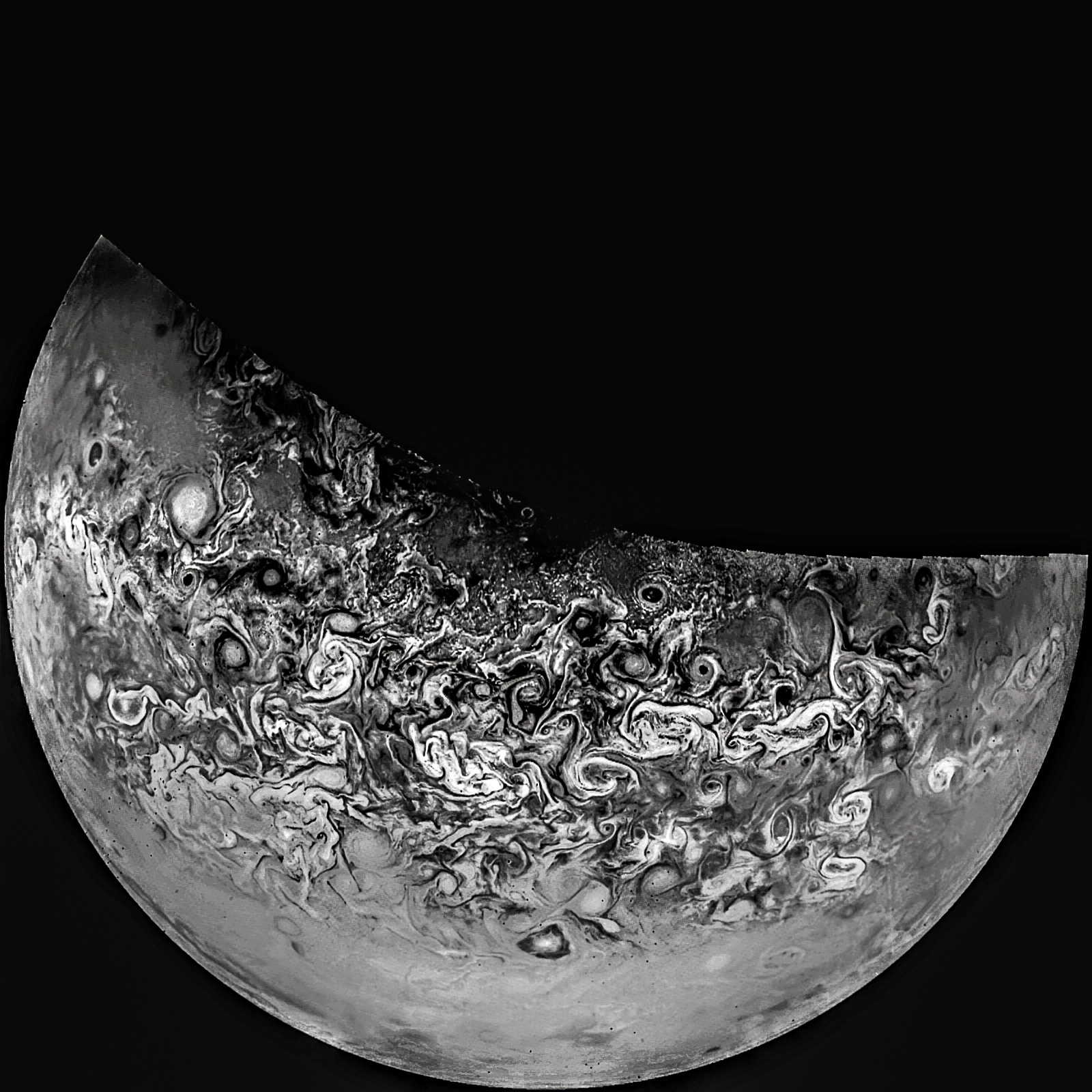 Image curve boosted to enhance fine details in cloud bands. Look closely and you can see vortex shedding! Black and white (red channel)