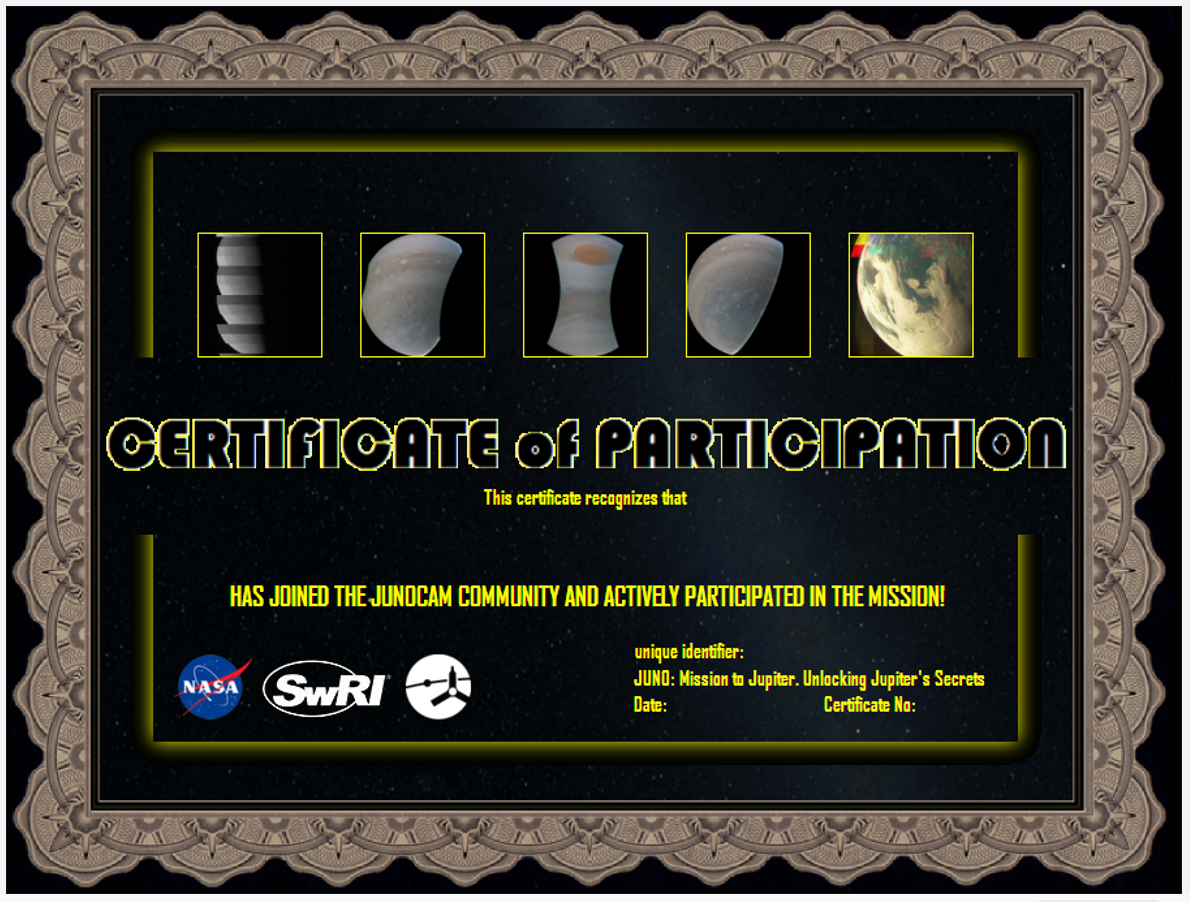 If YOU HAS JOINED THE JUNOCAM COMMUNITY AND HAS ACTIVELY PARTICIPATED IN THE MISSION you are welcome to download the Certificate; write your Name; the appropriate Date; your Unique Identifier; and add seven various Numbers and Letters for your own authentic certificate number.