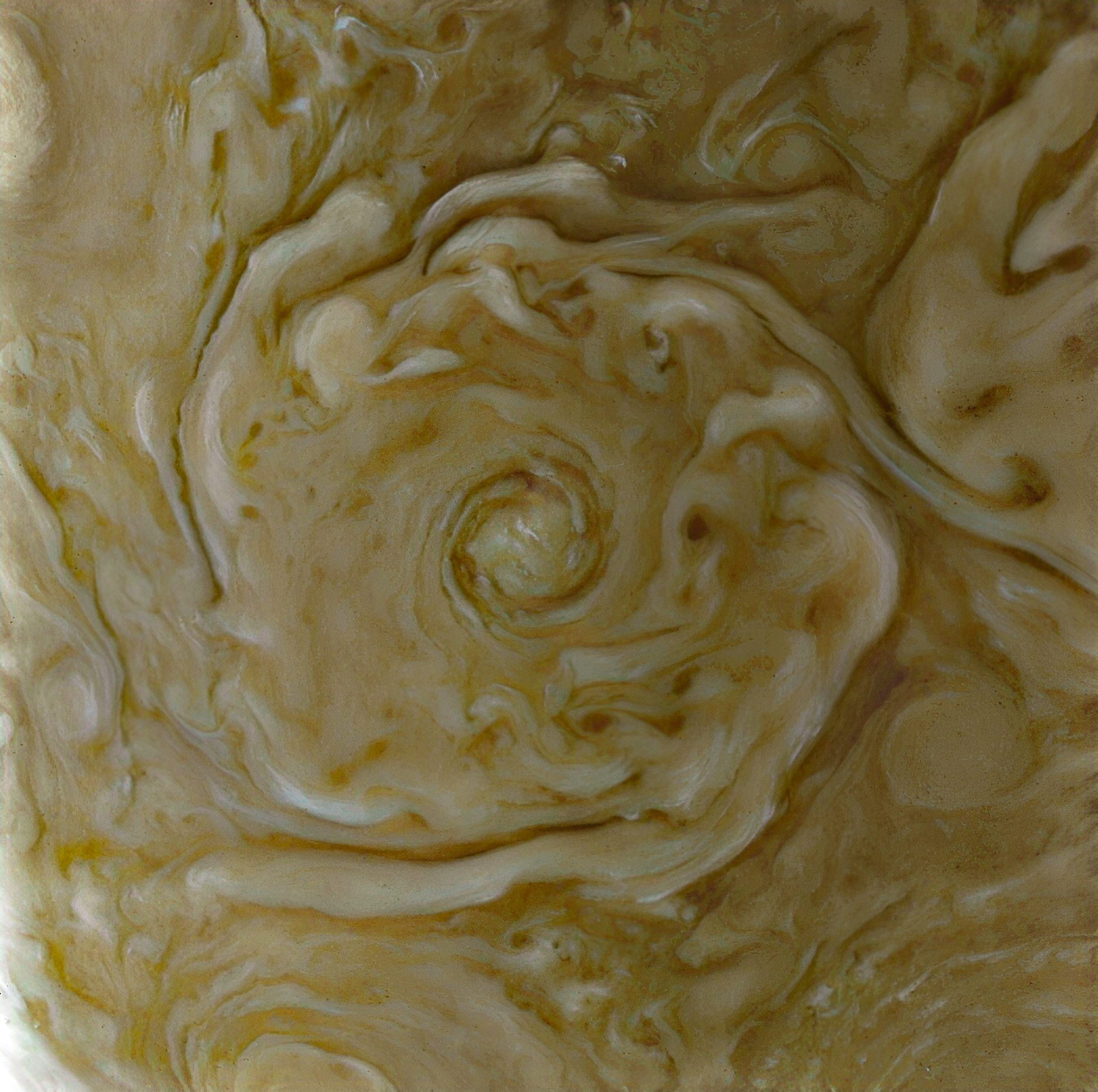Cyclone in enhanced false color -PJ70 North Pole at Minimum Emission Angle