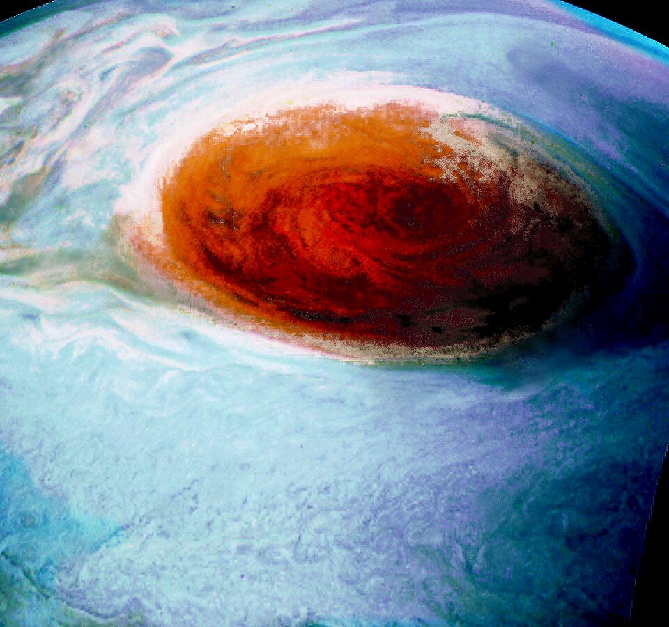 Junocam pixels are 12 bits deep from the camera but are converted to 8 bits inside the instrument using a lossless "companding" table, a process similar to gamma correction, to reduce their size. All Junocam products on the missionjuno website are in this 8-bit form as received on Earth. Scientific users interested in radiometric analysis should use the "RDR" data products archived with the Planetary Data System, which have been converted back to a linear 12-bit scale.