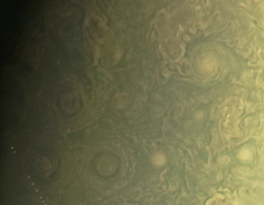 Junocam pixels are 12 bits deep from the camera but are converted to 8 bits inside the instrument using a lossless "companding" table, a process similar to gamma correction, to reduce their size. All Junocam products on the missionjuno website are in this 8-bit form as received on Earth. Scientific users interested in radiometric analysis should use the "RDR" data products archived with the Planetary Data System, which have been converted back to a linear 12-bit scale.
