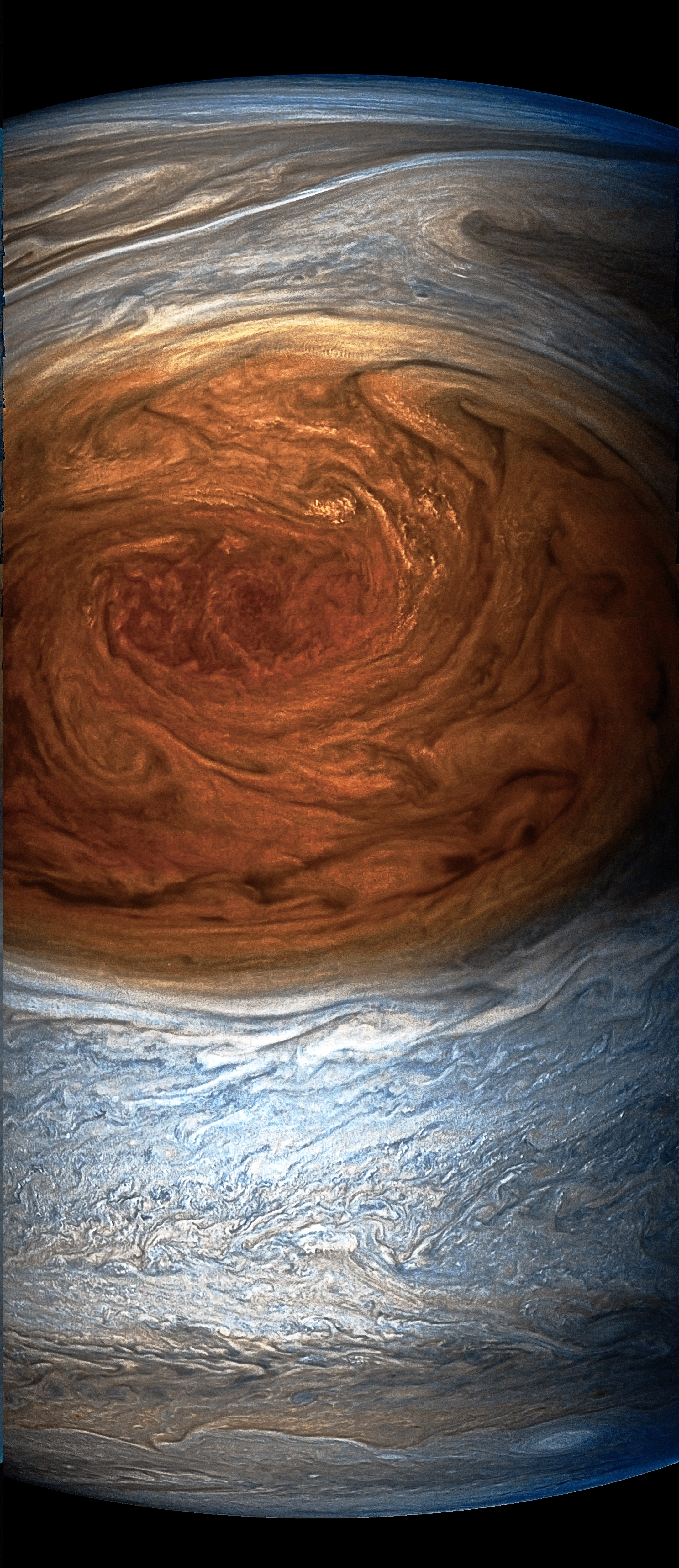 Junocam pixels are 12 bits deep from the camera but are converted to 8 bits inside the instrument using a lossless "companding" table, a process similar to gamma correction, to reduce their size. All Junocam products on the missionjuno website are in this 8-bit form as received on Earth. Scientific users interested in radiometric analysis should use the "RDR" data products archived with the Planetary Data System, which have been converted back to a linear 12-bit scale.