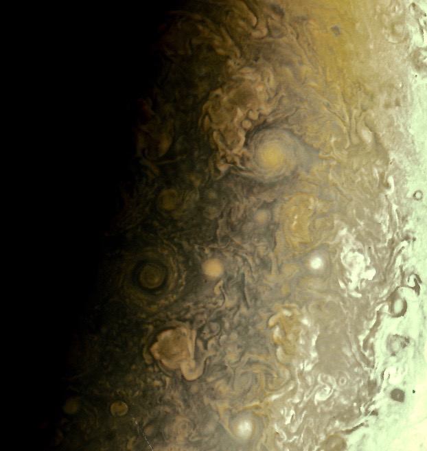 Using the raw data image from NASA, this image attempts to highlight the vortex shadows at Jupiter's terminator.