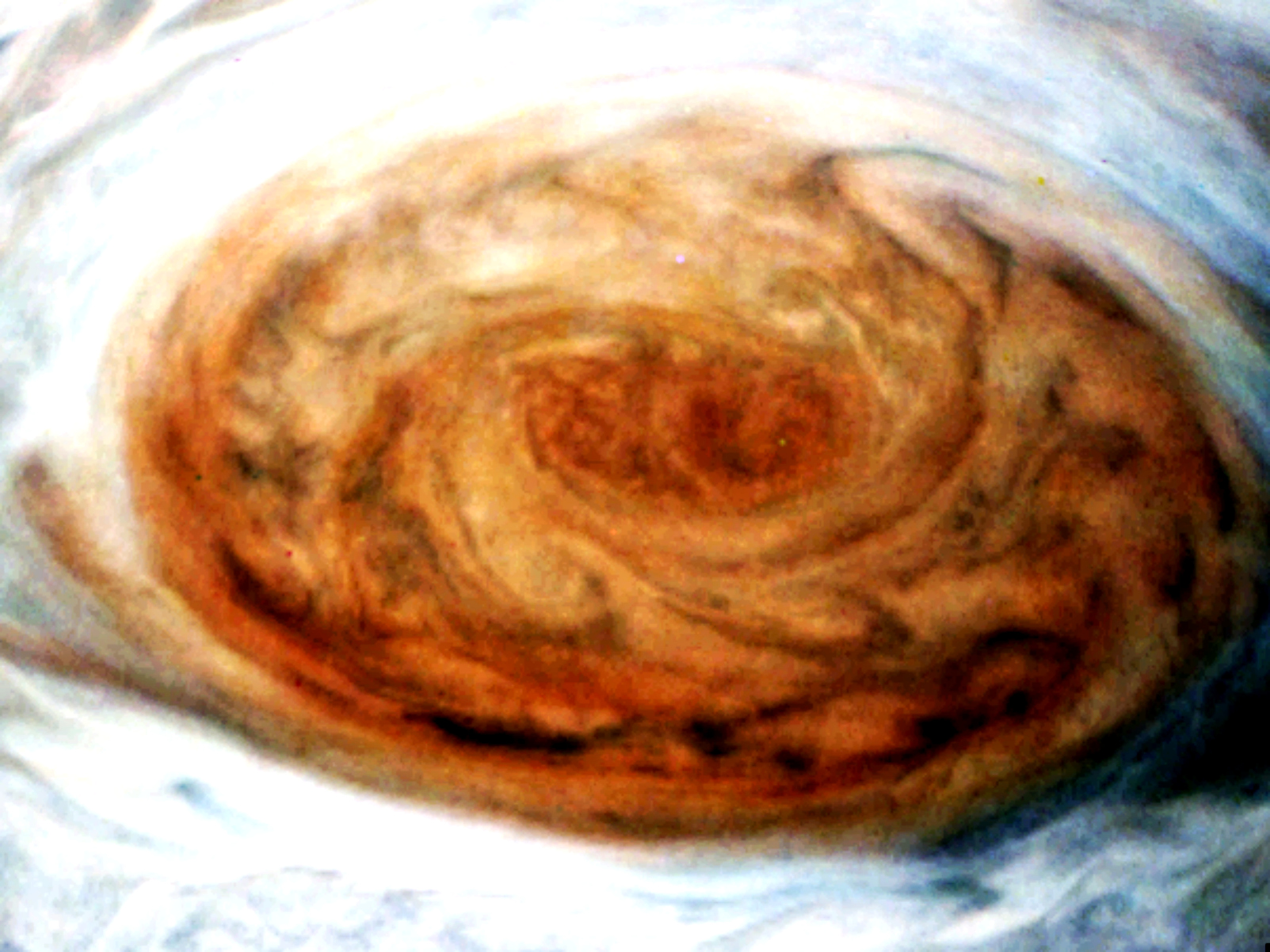 Was trying to get a better look at the structural (for lack of a better word) features of the red spot. Tweaked the contrast, saturation, etc. Got an interesting effect using orton.