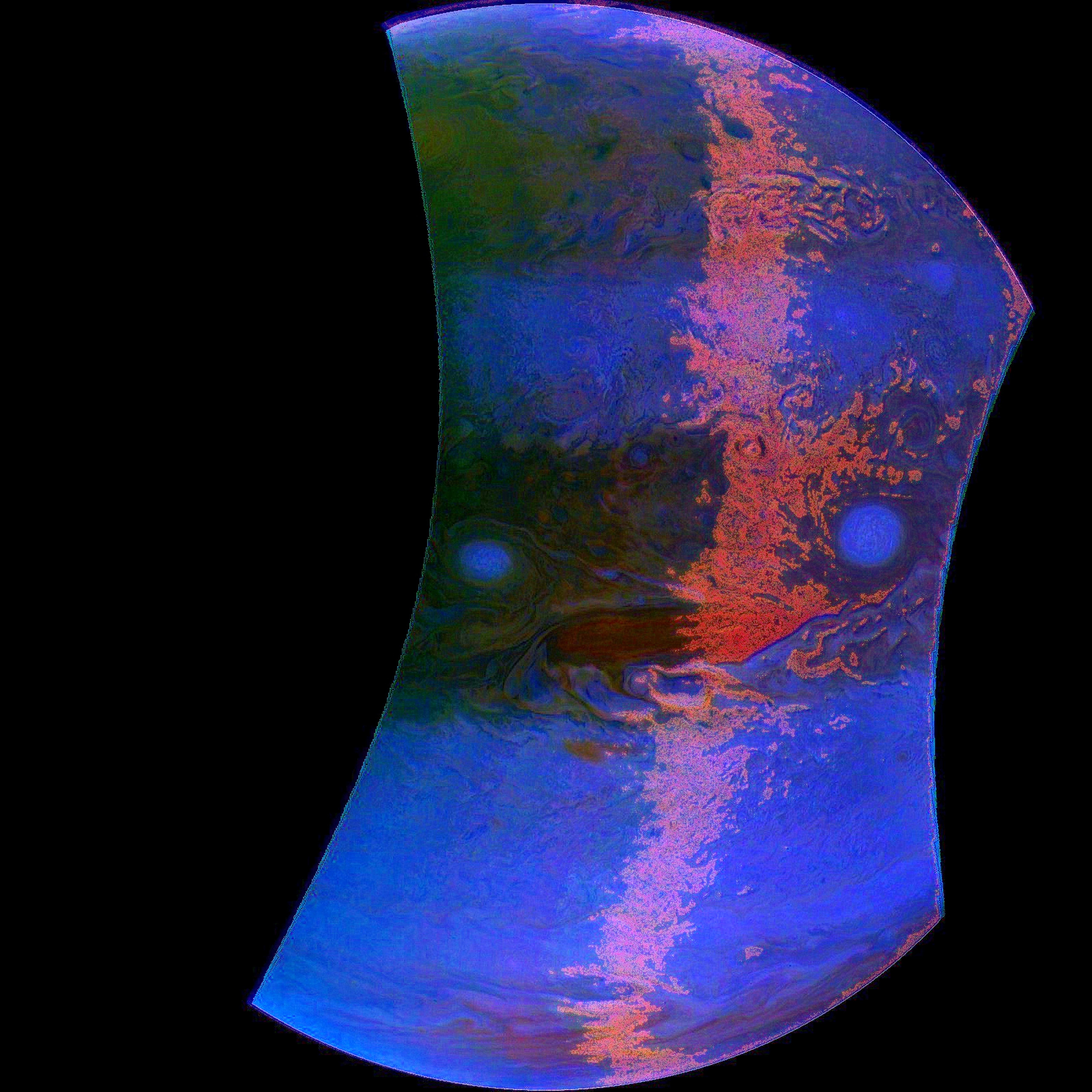 Junocam pixels are 12 bits deep from the camera but are converted to 8 bits inside the instrument using a lossless "companding" table, a process similar to gamma correction, to reduce their size. All Junocam products on the missionjuno website are in this 8-bit form as received on Earth. Scientific users interested in radiometric analysis should use the "RDR" data products archived with the Planetary Data System, which have been converted back to a linear 12-bit scale.