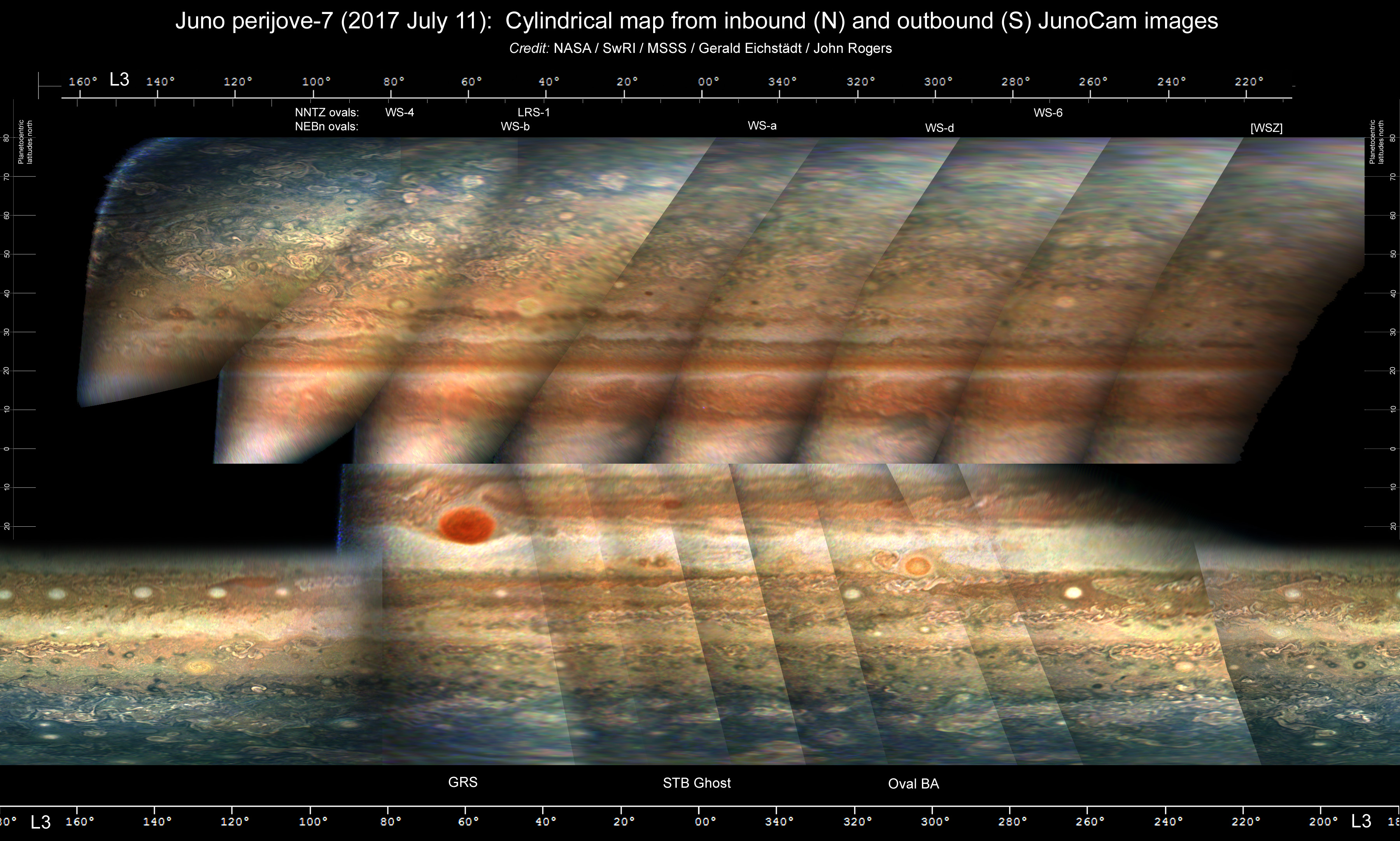 Gerald Eichstädt has made cylindrical projection maps from the inbound and outbound images at PJ7, which are here assembled into a map covering most of the planet. Labels above and below indicate the longitudes of the main circulations which can be seen at various latitudes. –John Rogers.