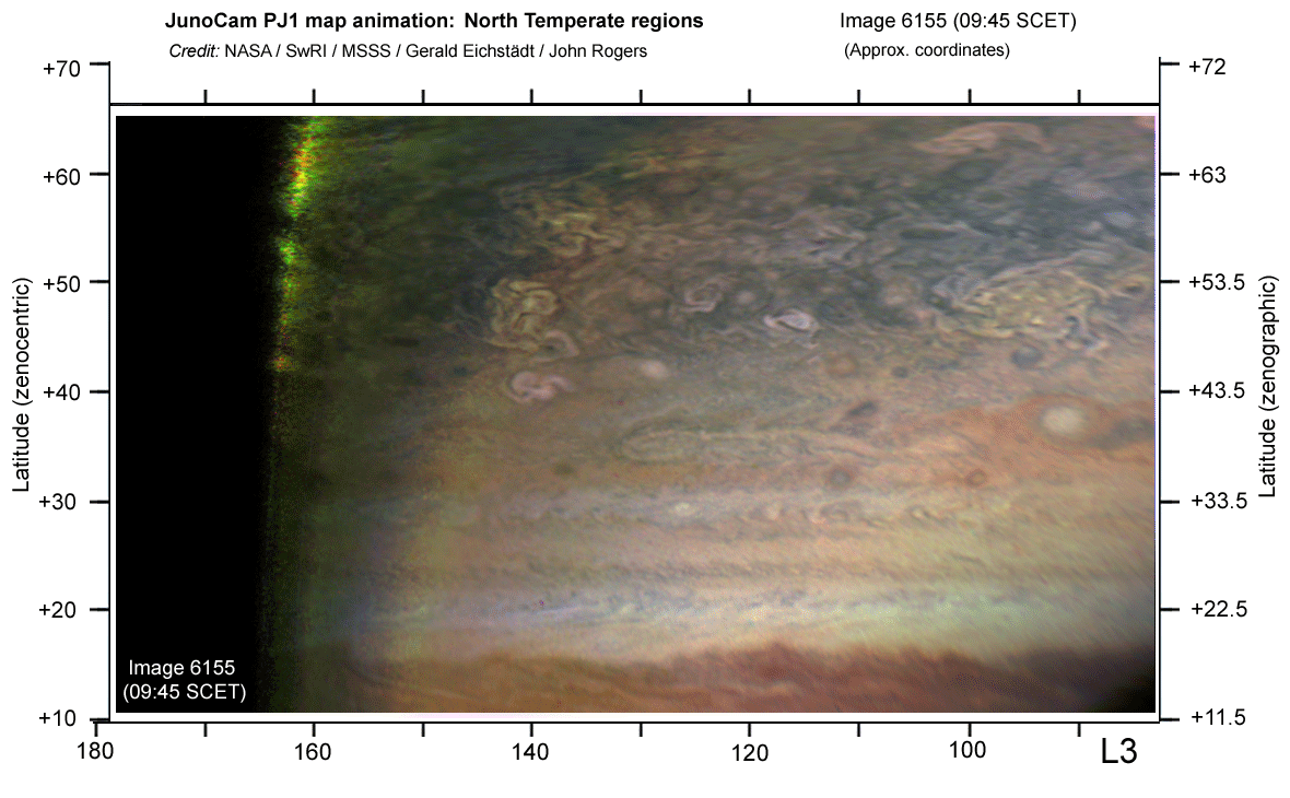 This animated triplet of maps, derived from JunoCam images by Gerald Eichstädt, shows winds in the North Temperate region. Techniques were the same as for the previous post covering the high northern latitudes. This animation (12-67ºN) is from 3 images at 30-min intervals, so real motions are very small, but several jets can be seen. The fastest is the NTBs jet (23.7ºN) which would erupt in a spectacular outbreak just a few weeks later.