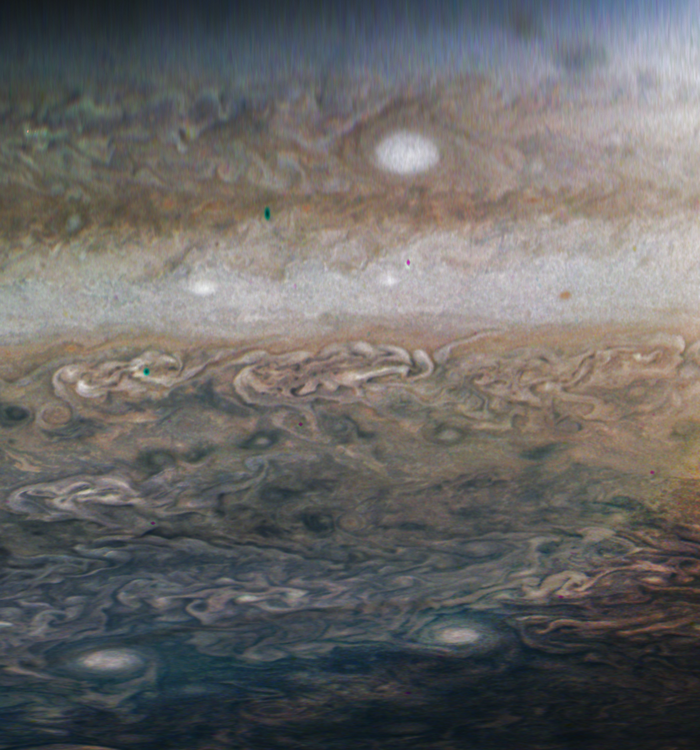 The planetocentric map is derived from the raw version of JunoCam image #6184. White-balancing on all brightness levels allowed for color enhancement. The processing also enhanced some of JunoCam's artifacts, visible as small greenish or pinkish spots.