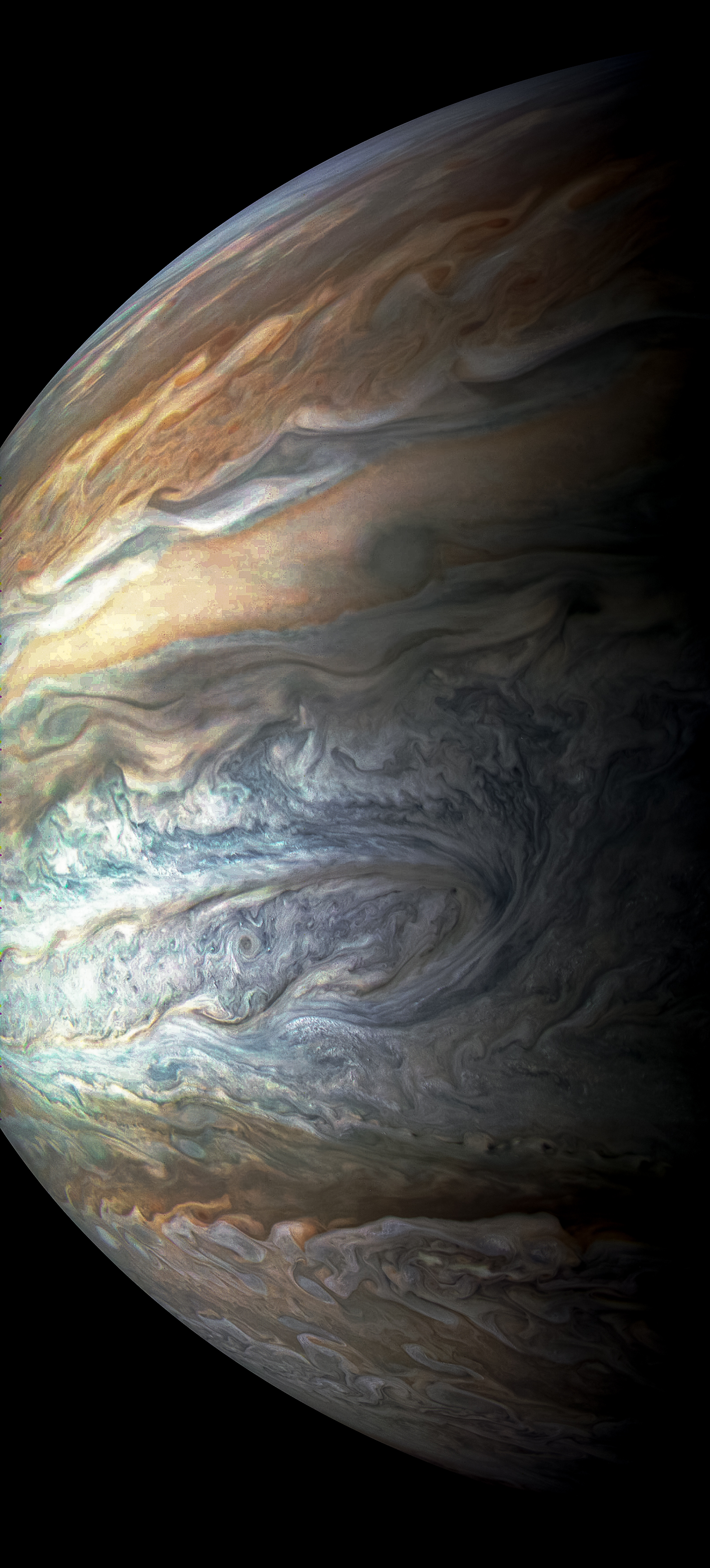 Junocam pixels are 12 bits deep from the camera but are converted to 8 bits inside the instrument using a lossless "companding" table, a process similar to gamma correction, to reduce their size. All Junocam products on the missionjuno website are in this 8-bit form as received on Earth. Scientific users interested in radiometric analysis should use the "RDR" data products archived with the Planetary Data System, which have been converted back to a linear 12-bit scale.