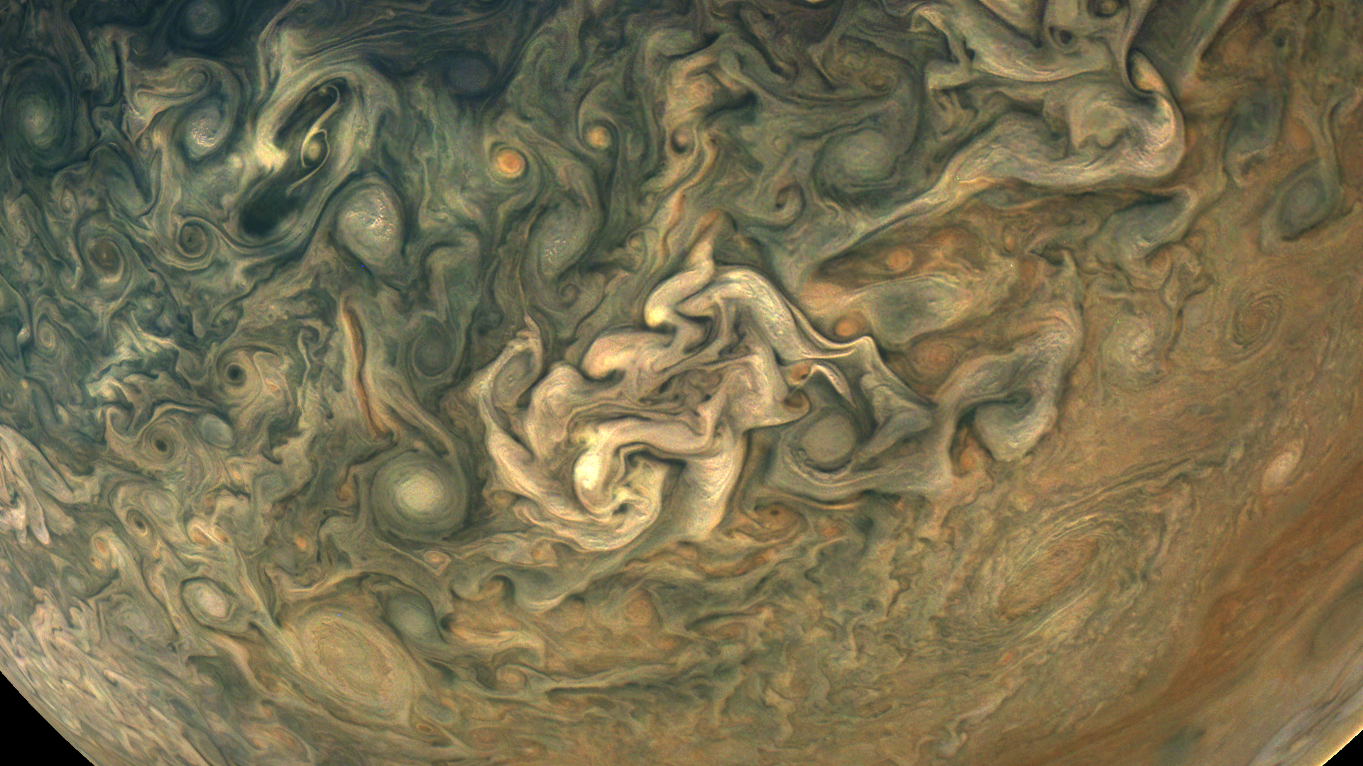 Perijove 10, Northern latitude coverage, HD Reprojection, enhanced colors