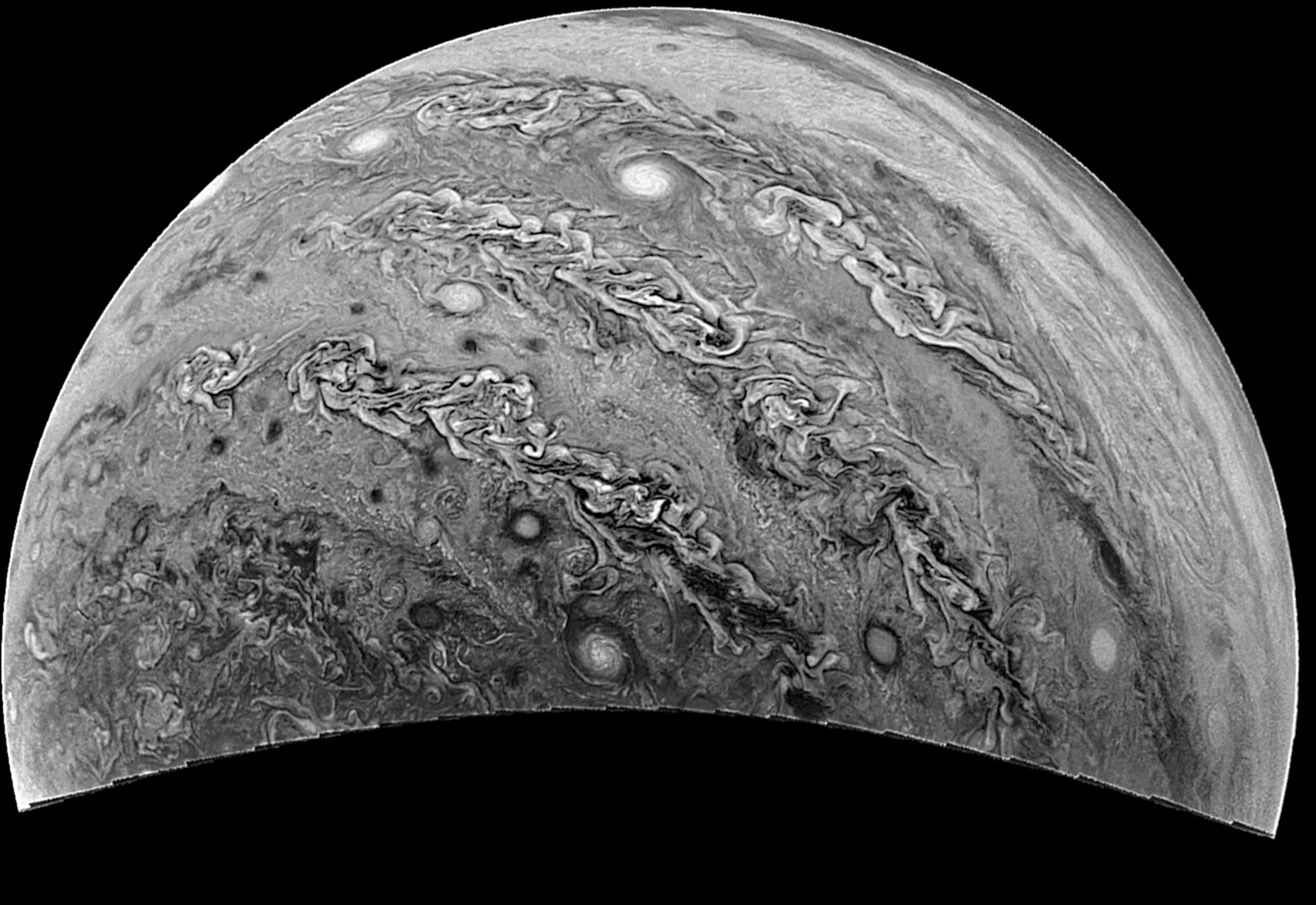 Junocam pixels are 12 bits deep from the camera but are converted to 8 bits inside the instrument using a lossless "companding" table, a process similar to gamma correction, to reduce their size. All Junocam products on the missionjuno website are in this 8-bit form as received on Earth. Scientific users interested in radiometric analysis should use the "RDR" data products archived with the Planetary Data System, which have been converted back to a linear 12-bit scale.