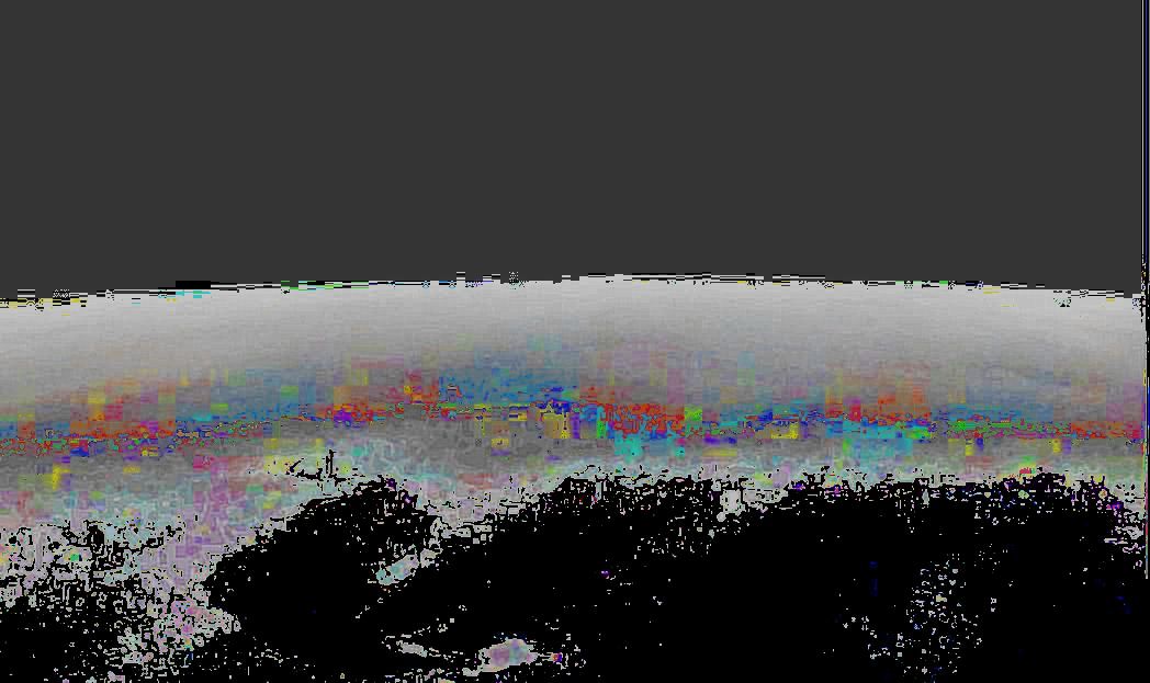 Junocam pixels are 12 bits deep from the camera but are converted to 8 bits inside the instrument using a lossless "companding" table, a process similar to gamma correction, to reduce their size. All Junocam products on the missionjuno website are in this 8-bit form as received on Earth. Scientific users interested in radiometric analysis should use the "RDR" data products archived with the Planetary Data System, which have been converted back to a linear 12-bit scale.