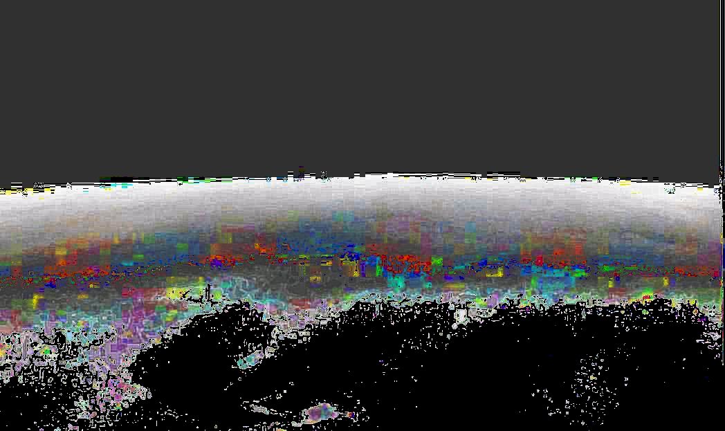 Junocam pixels are 12 bits deep from the camera but are converted to 8 bits inside the instrument using a lossless "companding" table, a process similar to gamma correction, to reduce their size. All Junocam products on the missionjuno website are in this 8-bit form as received on Earth. Scientific users interested in radiometric analysis should use the "RDR" data products archived with the Planetary Data System, which have been converted back to a linear 12-bit scale.