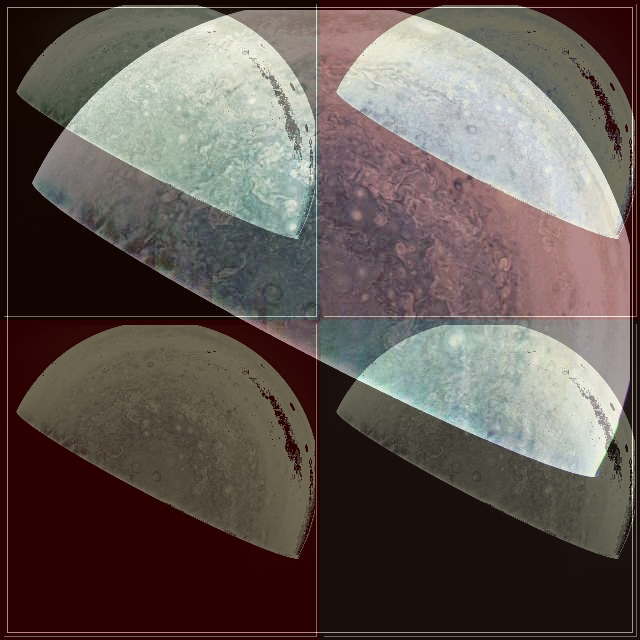 The first perijove pass of Jupiter was a test run for JunoCam. The set of 28 images taken were designed to find optimal viewing geometries and camera settings. For example, we took 4 images of the north pole. We used two different settings for the time-delayed-integration (TDI), which determines the integration time, to see which would be best for the polar region and a very high TDI level (long exposure) to try to detect Jupiter’s aurora. We imaged at two different geometries, looking directly down at the pole and looking at closest range at a more oblique angle, to see which would give us the best results. We ran through a similar set of tests for the south pole. Another comparison we made was to test different compression settings.