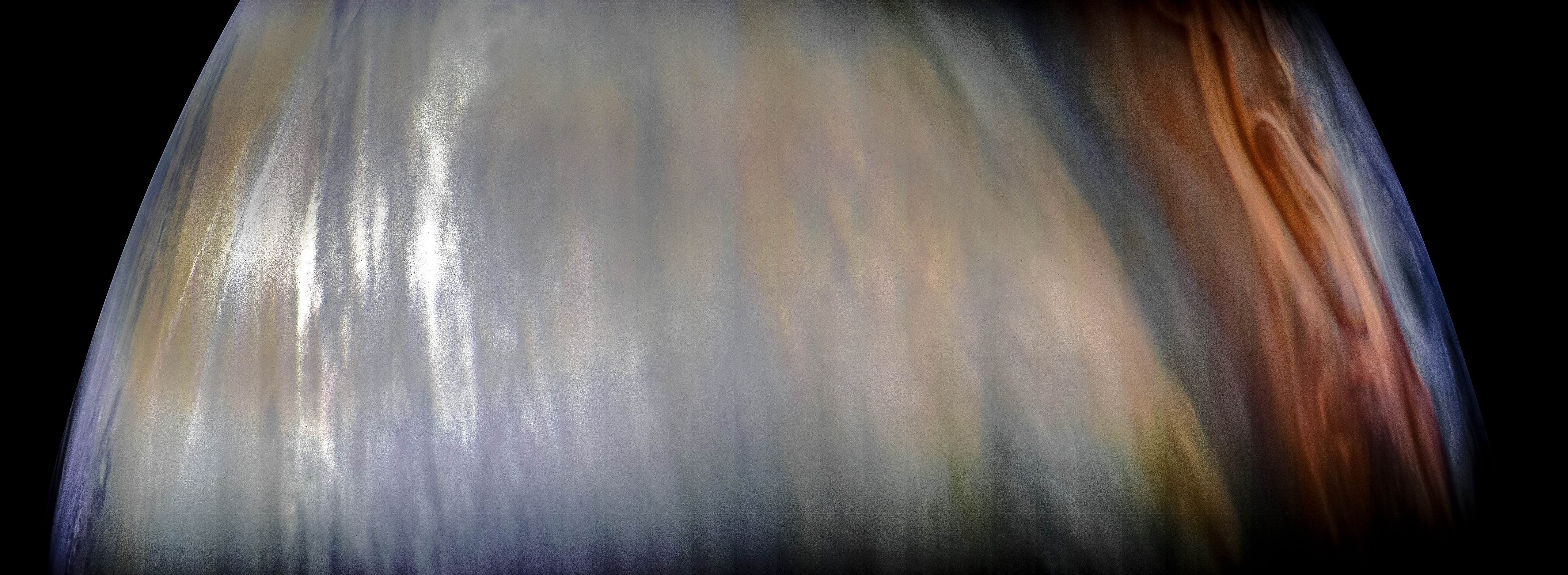Junocam pixels are 12 bits deep from the camera but are converted to 8 bits inside the instrument using a lossless "companding" table, a process similar to gamma correction, to reduce their size. All Junocam products on the missionjuno website are in this 8-bit form as received on Earth. Scientific users interested in radiometric analysis should use the "RDR" data products archived with the Planetary Data System, which have been converted back to a linear 12-bit scale.