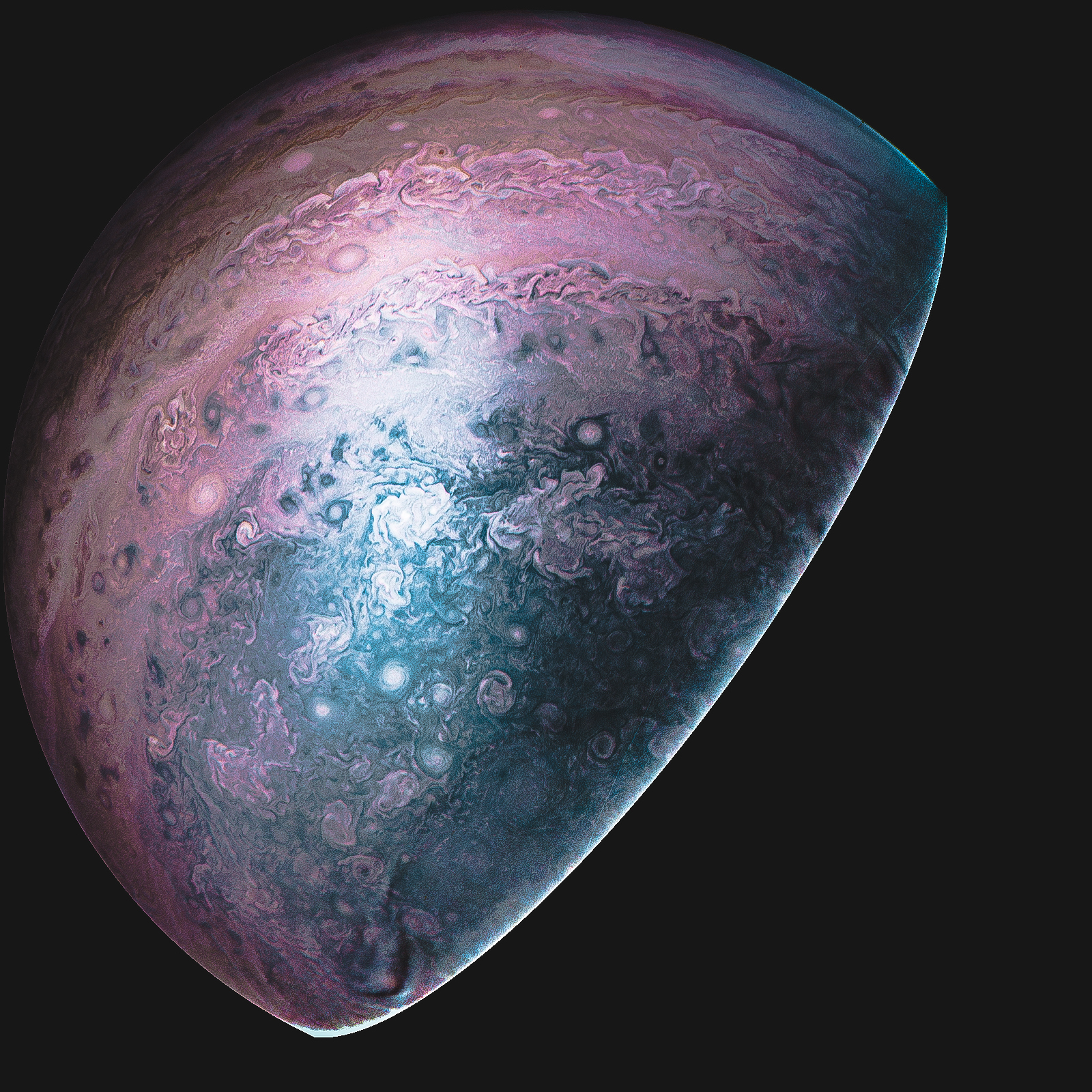 A colourised re-touch of the POI: SOUTH POLAR REGION JunoCam photograph.