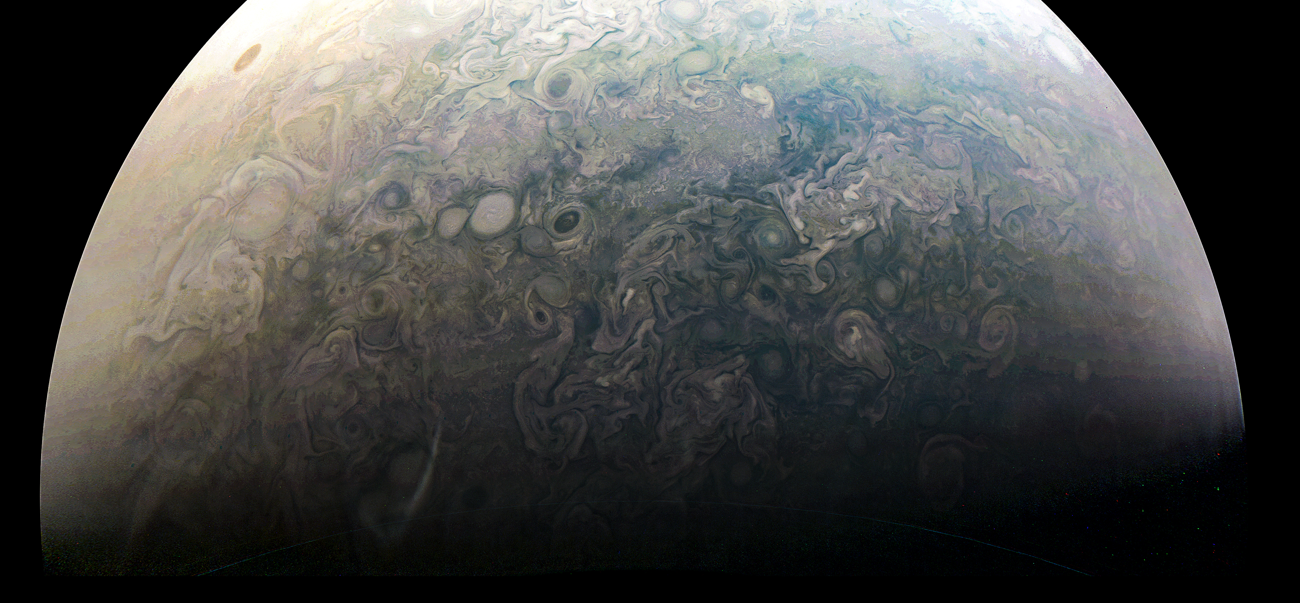 Junocam pixels are 12 bits deep from the camera but are converted to 8 bits inside the instrument using a lossless "companding" table, a process similar to gamma correction, to reduce their size. All Junocam products on the missionjuno website are in this 8-bit form as received on Earth. Scientific users interested in radiometric analysis should use the "RDR" data products archived with the Planetary Data System, which have been converted back to a linear 12-bit scale.
