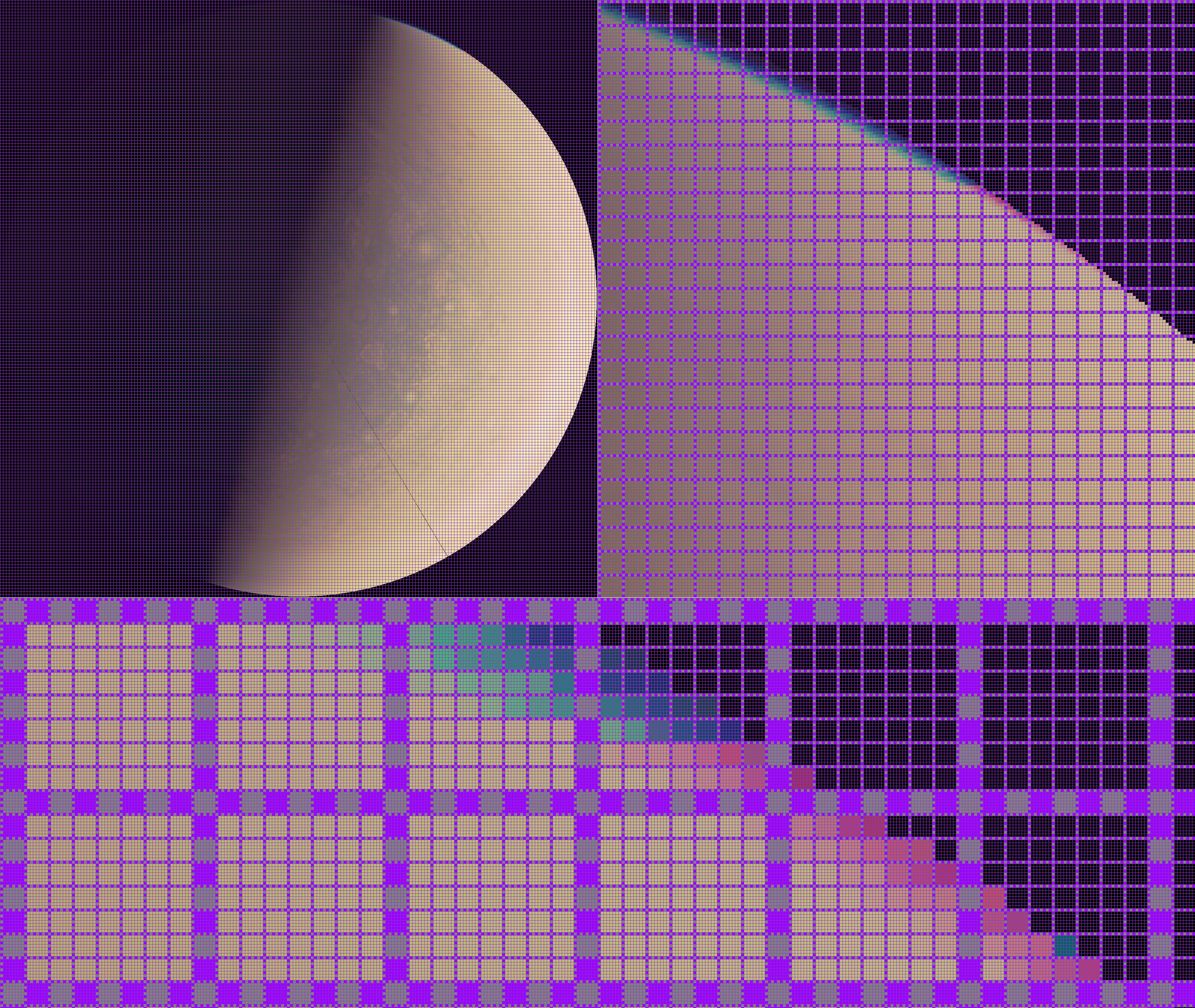 Digital Art Color Experiment. 'South pole at minimum emission angle' processed on Windows and Windows Paint. Processes: Windows Paint Grid at zoom x8 was 'Print Screened' and applied at the front of the image. Than a random area from the image is zoomed at x8; a command Grid is applied; command 'Print Screen' and than the image area is Cropped. Than a random area from the zoom x8 Cropped image is zoomed at x8; a command Grid is applied again; command 'Print Screen' and than the image area is Cropped. Inverted Colors. Monochrome. Colored [the colors from the Juno on-line Game were used]; Inverted Colors.