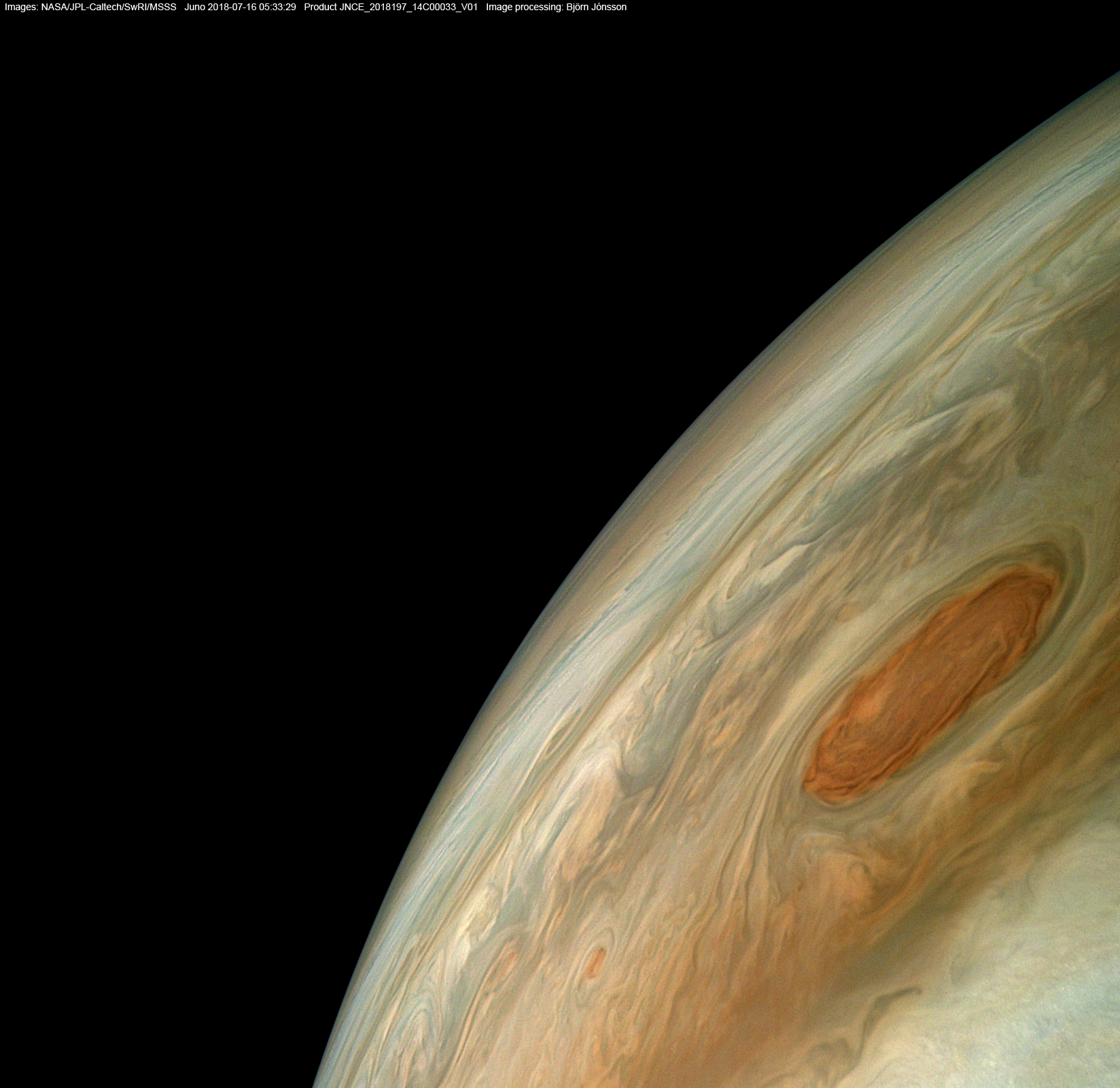 An image processed from the raw image PJ14_33 framelets. The color and contrast is exaggerated in this image and small scale features have been sharpened.