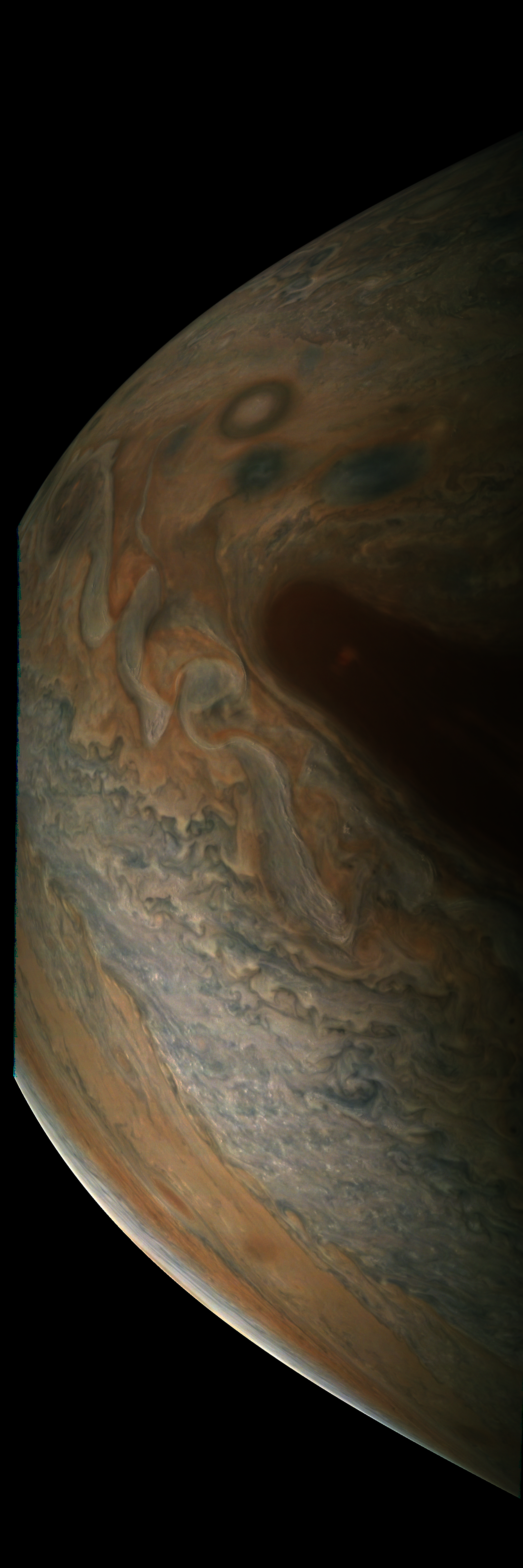 Junocam pixels are 12 bits deep from the camera but are converted to 8 bits inside the instrument using a lossless "companding" table, a process similar to gamma correction, to reduce their size. All Junocam products on the missionjuno website are in this 8-bit form as received on Earth. Scientific users interested in radiometric analysis should use the "RDR" data products archived with the Planetary Data System, which have been converted back to a linear 12-bit scale.