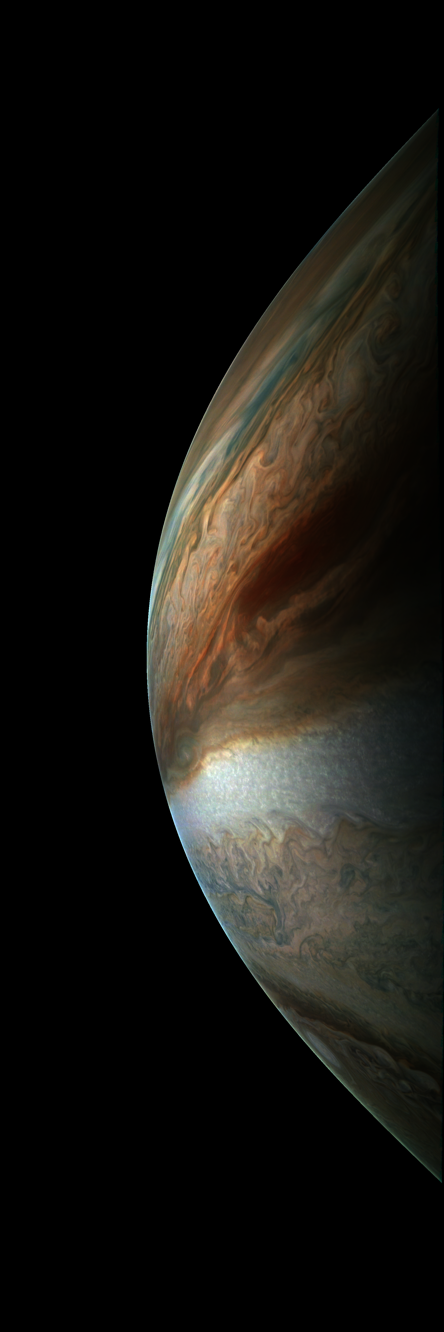 Junocam pixels are 12 bits deep from the camera but are converted to 8 bits inside the instrument using a lossless "companding" table, a process similar to gamma correction, to reduce their size. All Junocam products on the missionjuno website are in this 8-bit form as received on Earth. Scientific users interested in radiometric analysis should use the "RDR" data products archived with the Planetary Data System, which have been converted back to a linear 12-bit scale.
