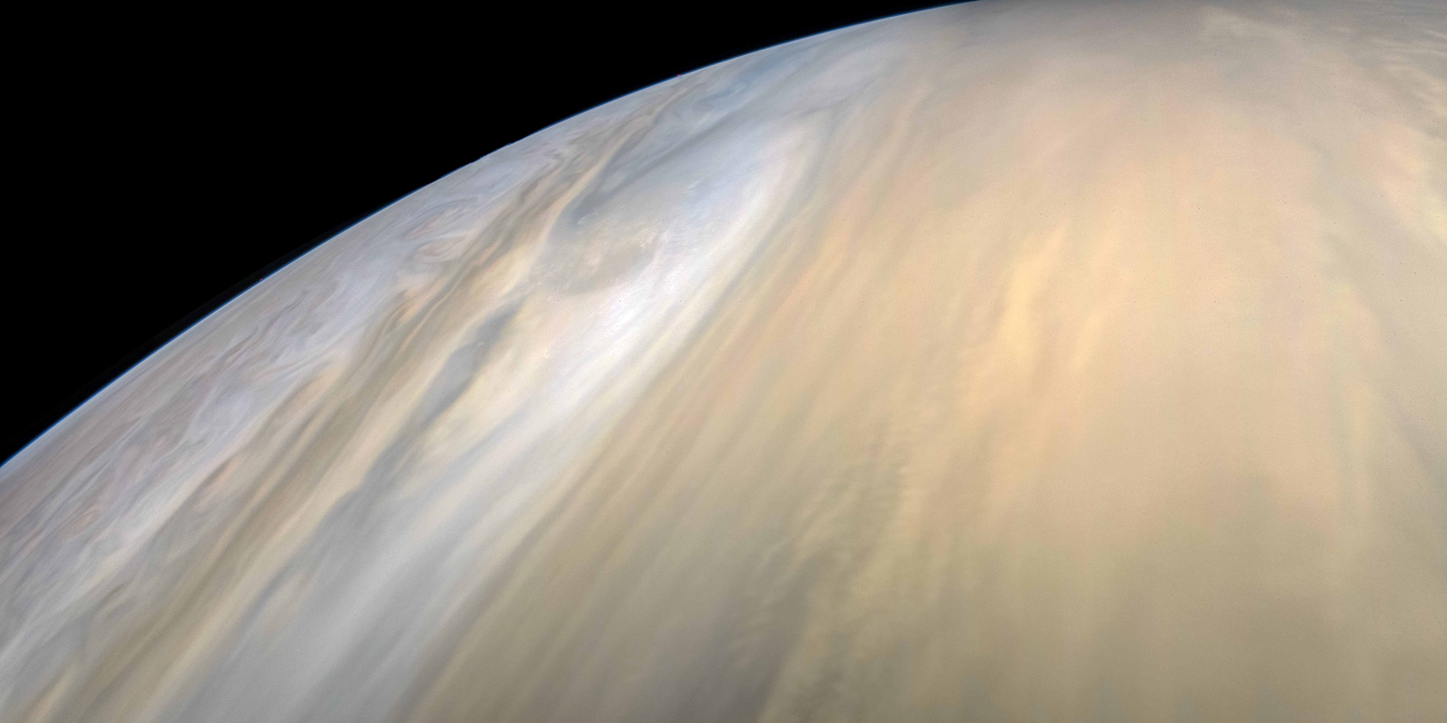 Junocam pixels are 12 bits deep from the camera but are converted to 8 bits inside the instrument using a lossless "companding" table, a process similar to gamma correction, to reduce their size. All Junocam products on the missionjuno website are in this 8-bit form as received on Earth. Scientific users interested in radiometric analysis should use the "RDR" data products archived with the Planetary Data System, which have been converted back to a linear 12-bit scale.