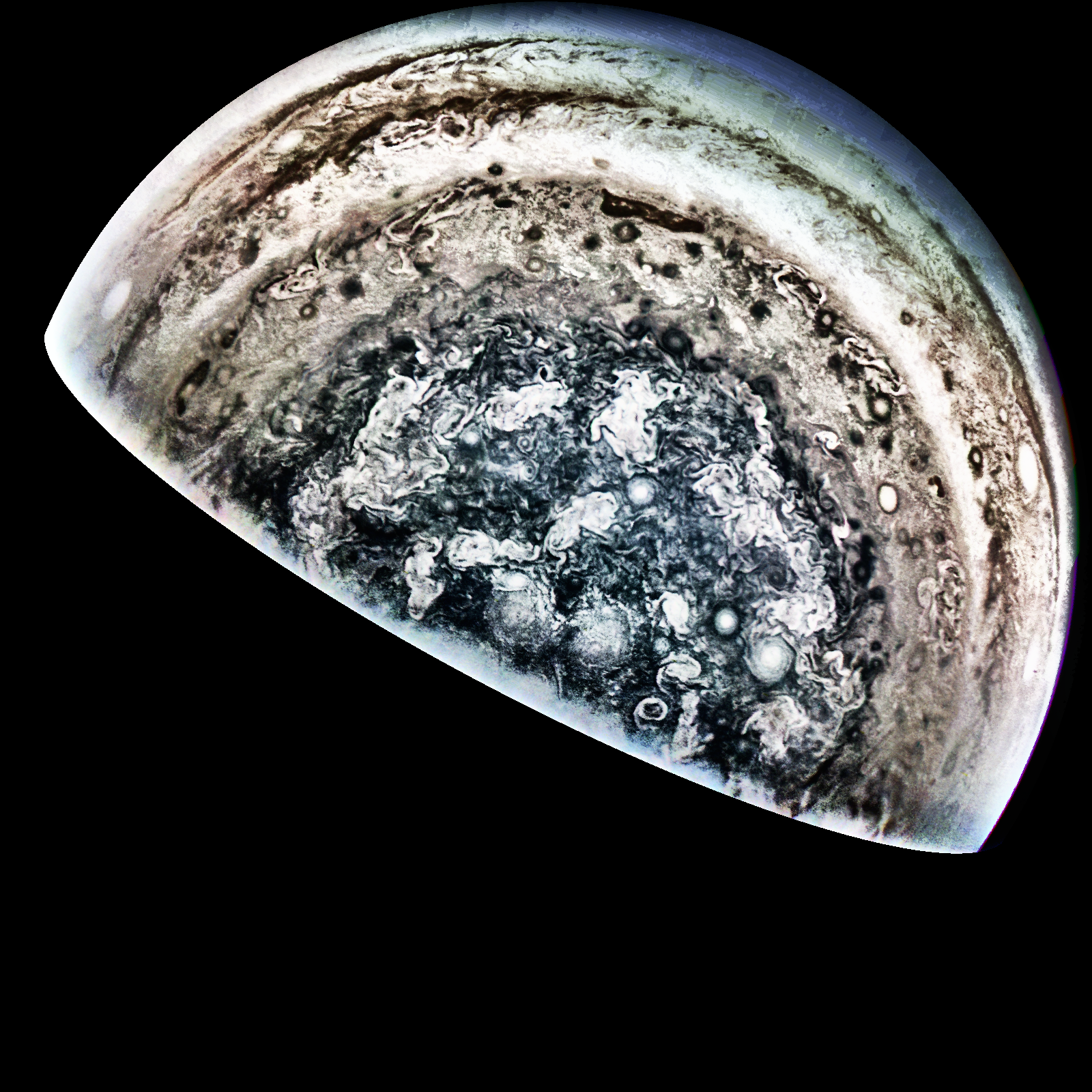 Junocam pixels are 12 bits deep from the camera but are converted to 8 bits inside the instrument using a lossless "companding" table, a process similar to gamma correction, to reduce their size. All Junocam products on the missionjuno website are in this 8-bit form as received on Earth. Scientific users interested in radiometric analysis should use the "RDR" data products archived with the Planetary Data System, which have been converted back to a linear 12-bit scale.