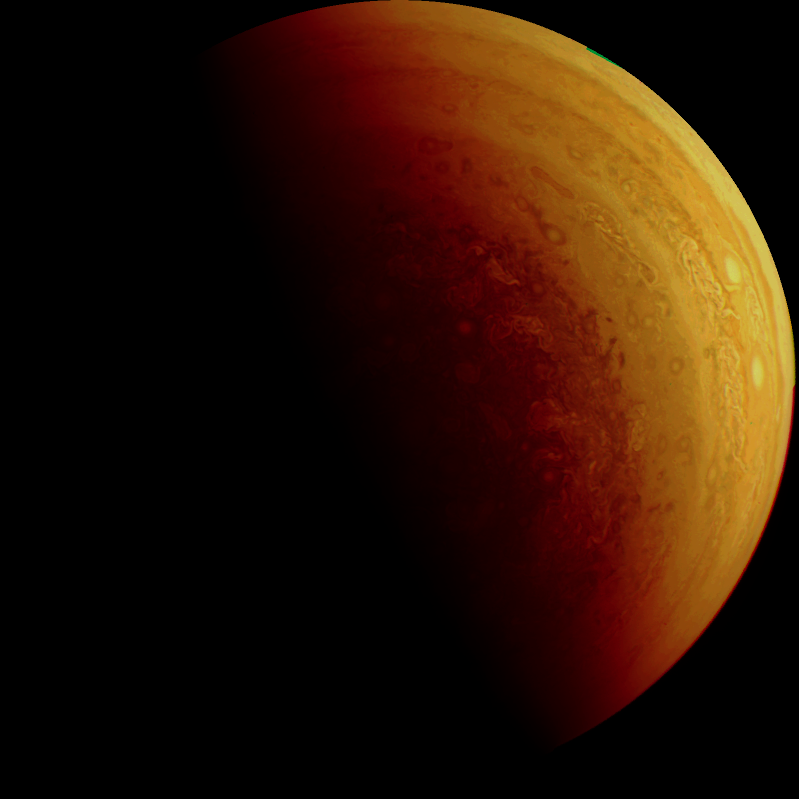 Junocam pixels are 12 bits deep from the camera but are converted to 8 bits inside the instrument using a lossless "companding" table, a process similar to gamma correction, to reduce their size. All Junocam products on the missionjuno website are in this 8-bit form as received on Earth. Scientific users interested in radiometric analysis should use the "RDR" data products archived with the Planetary Data System, which have been converted back to a linear 12-bit scale.