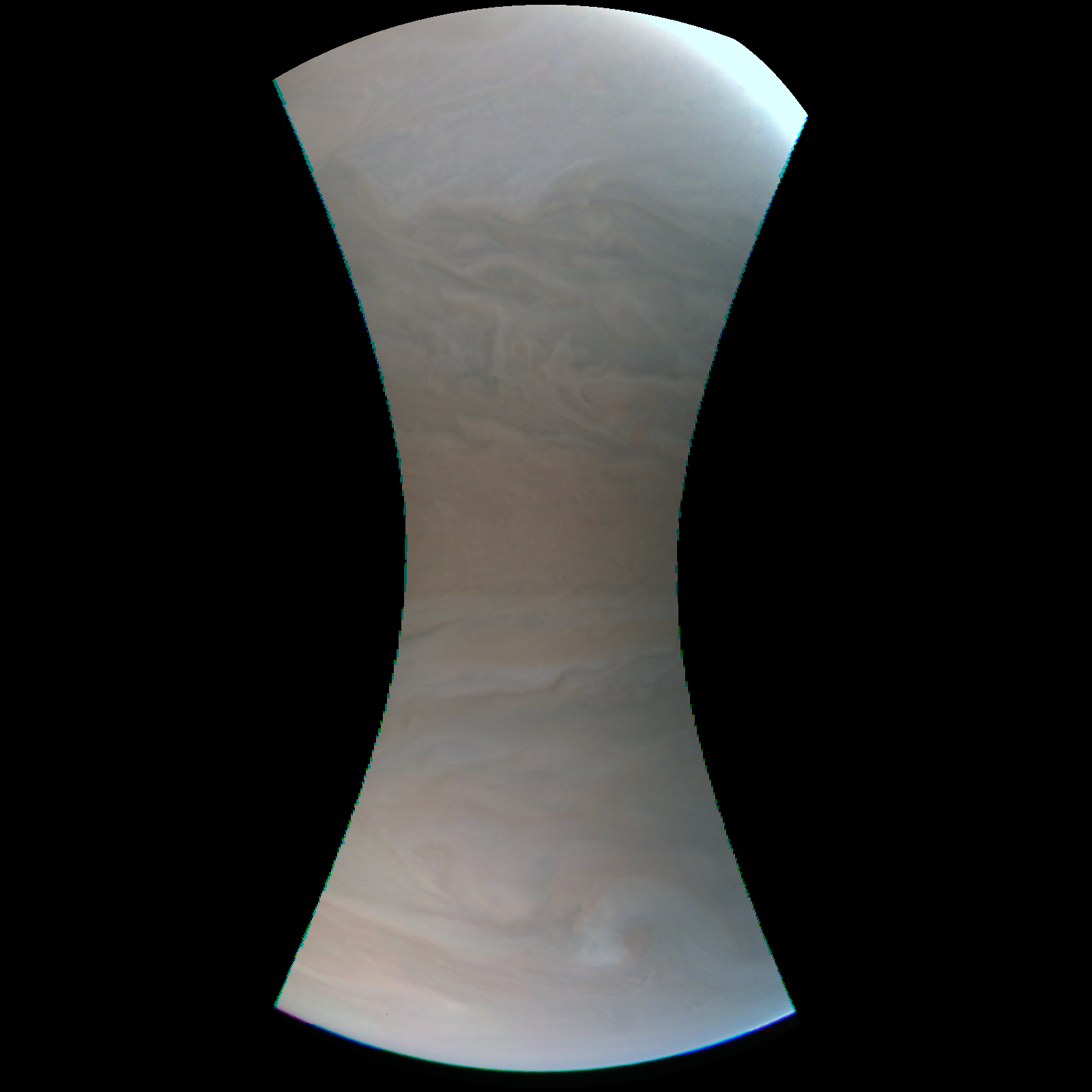 Junocam pixels are 12 bits deep from the camera but are converted to 8 bits inside the instrument using a lossless "companding" table, a process similar to gamma correction, to reduce their size. All Junocam products on the missionjuno website are in this 8-bit form as received on Earth. Scientific users interested in radiometric analysis should use the "RDR" data products archived with the Planetary Data System, which have been converted back to a linear 12-bit scale.