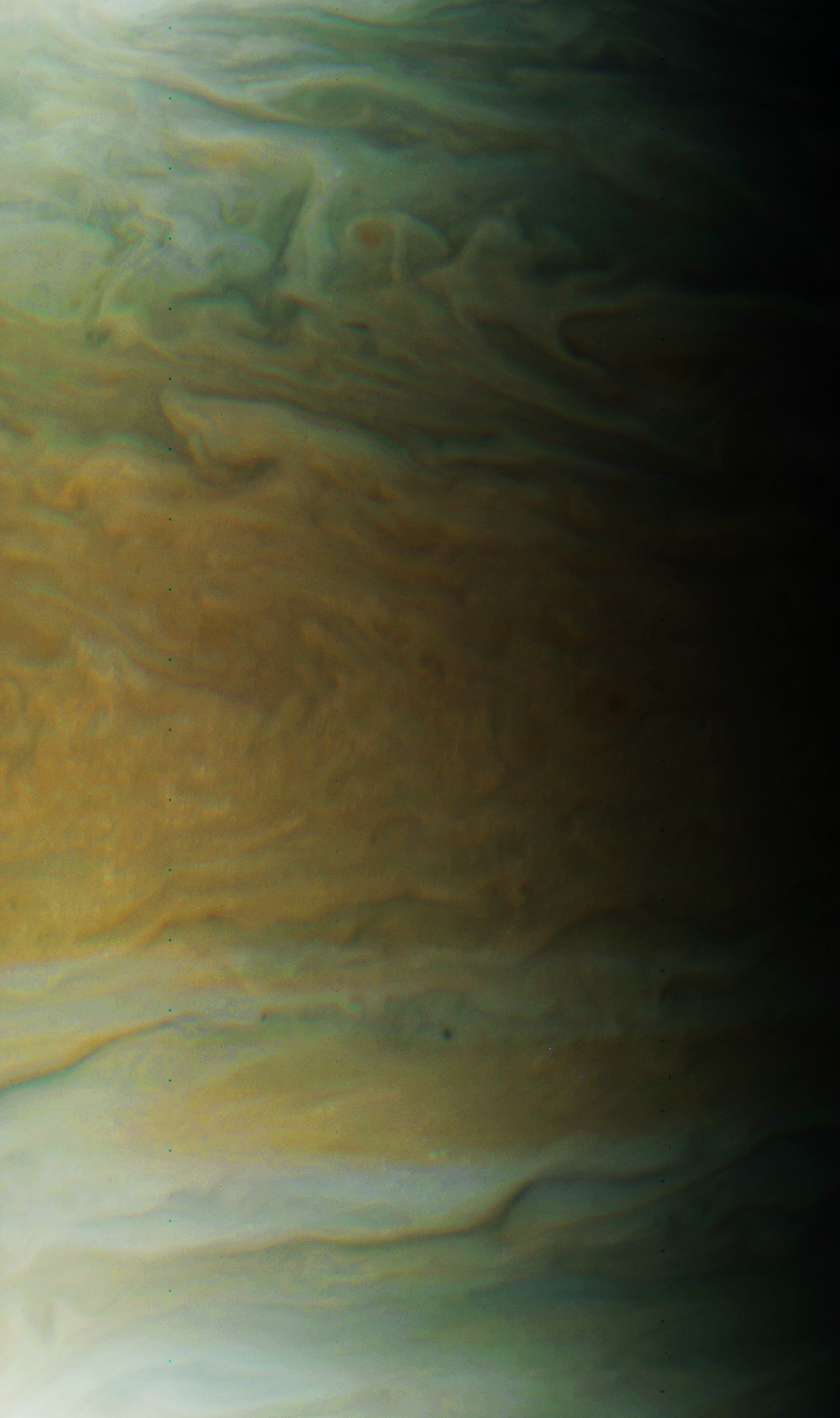 Junocam pixels are 12 bits deep from the camera but are converted to 8 bits inside the instrument using a lossless "companding" table, a process similar to gamma correction, to reduce their size. All Junocam products on the missionjuno website are in this 8-bit form as received on Earth. Scientific users interested in radiometric analysis should use the "RDR" data products archived with the Planetary Data System, which have been converted back to a linear 12-bit scale.