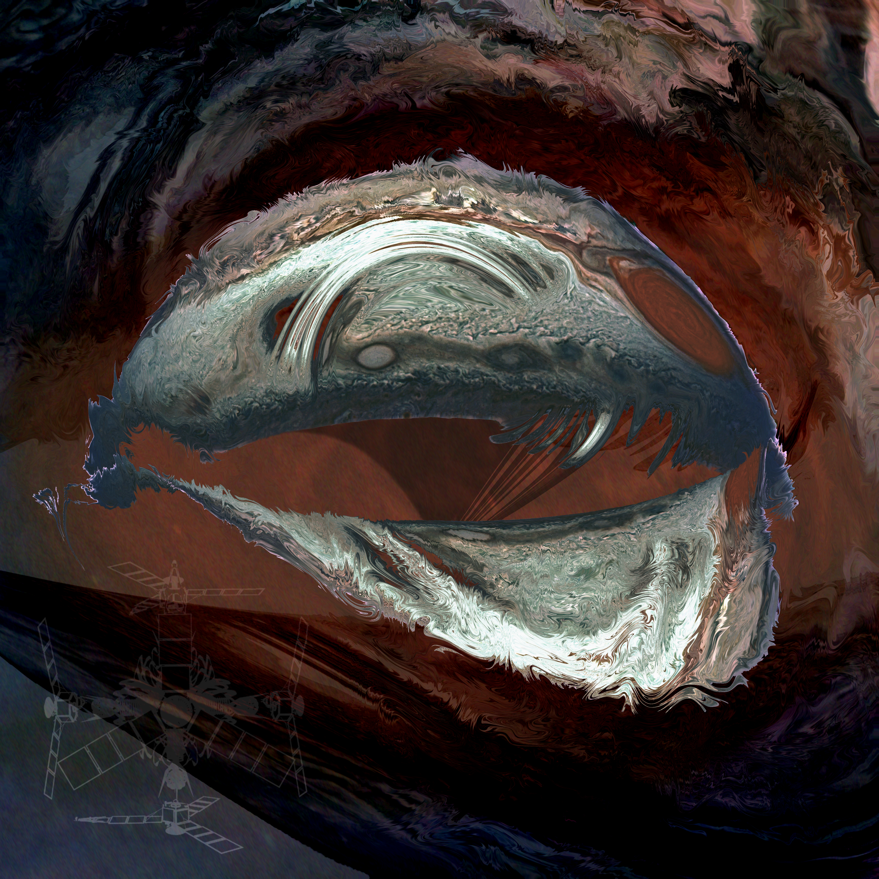 Using raw images from the NASA Juno probe- Jovial is the product of the images collected during flyby 18 (Perijove 18). Created on 23rd March 2019, Jovial awoke. Custom Juno motif also visible. Processed with GIMP and then abstracted. This took a few hours :-)