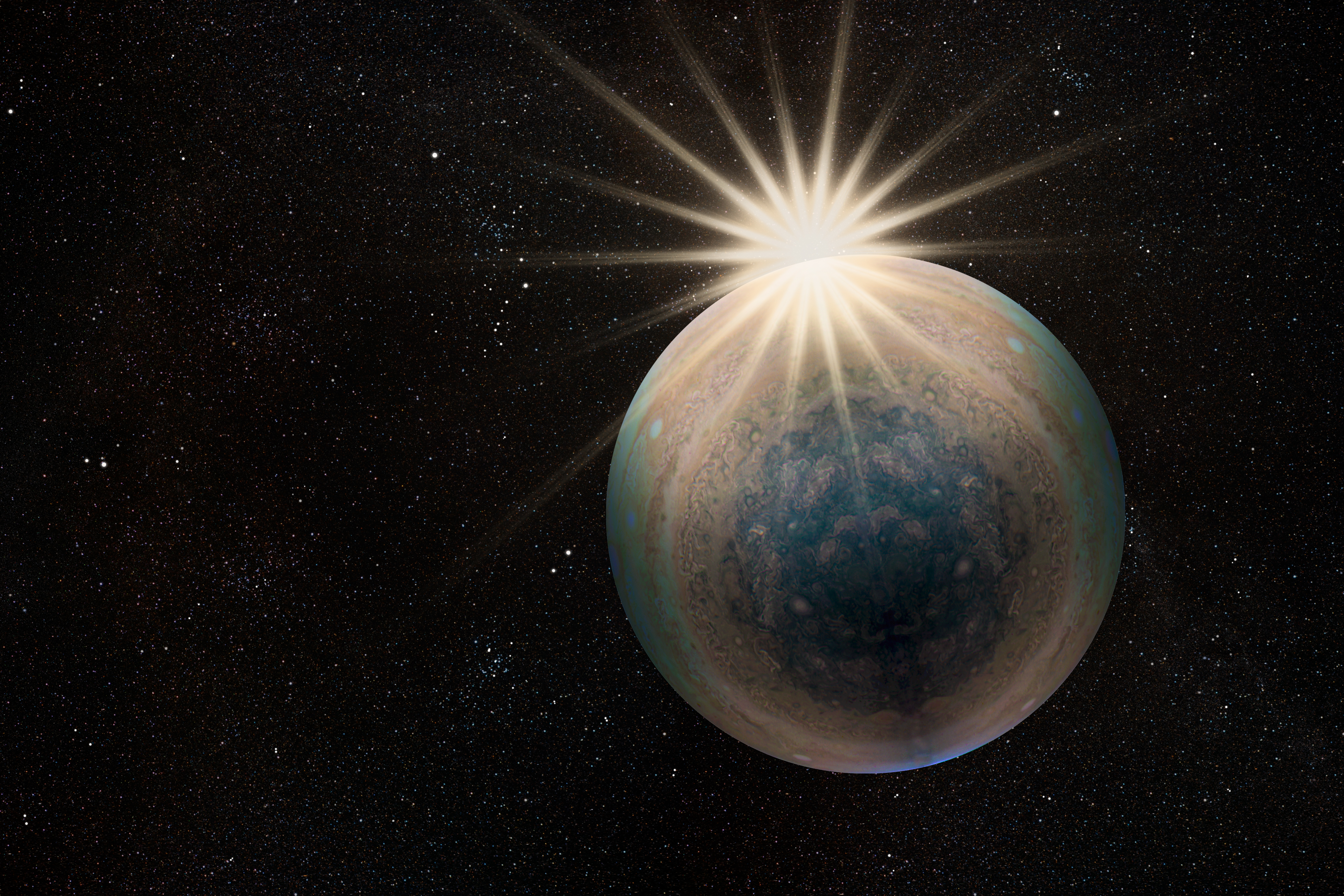 Based on images from PJ19, this starscape rendition shows the sun rising over the edge of Jupiter.