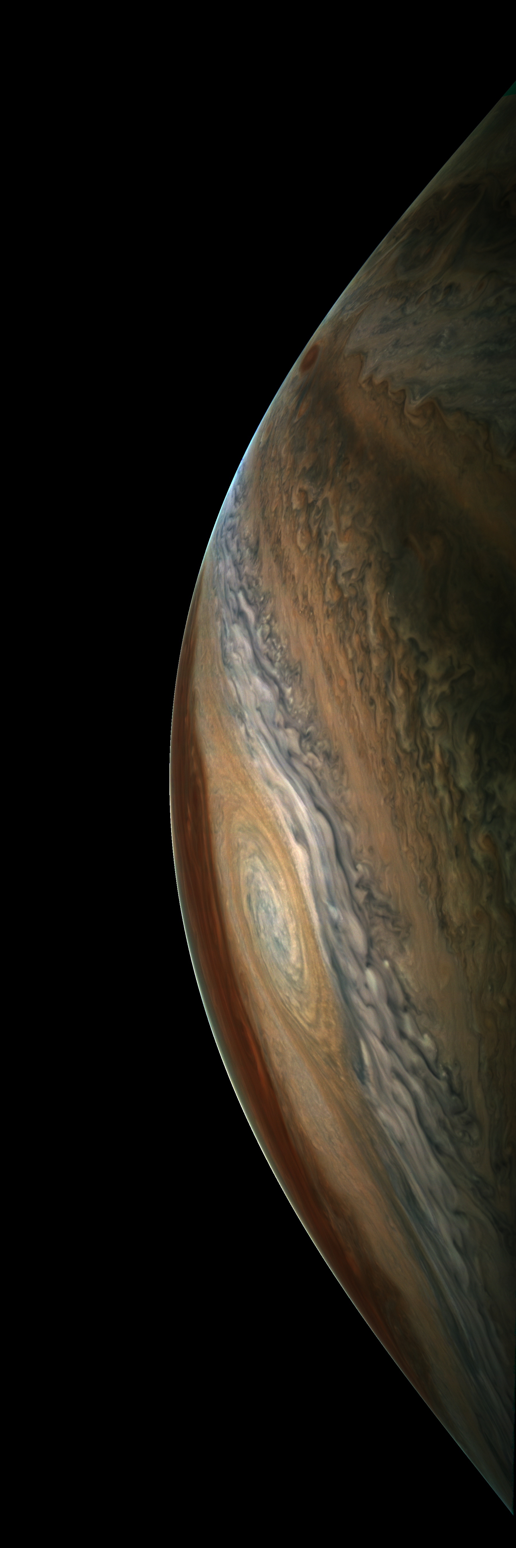 Resolution is 30 pixels per degrees in an equidistant cylindrical system centered to the camera at image stop time, with an axis parallel to Juno's spin axis. The rendered field of view is 60x180 degrees.
