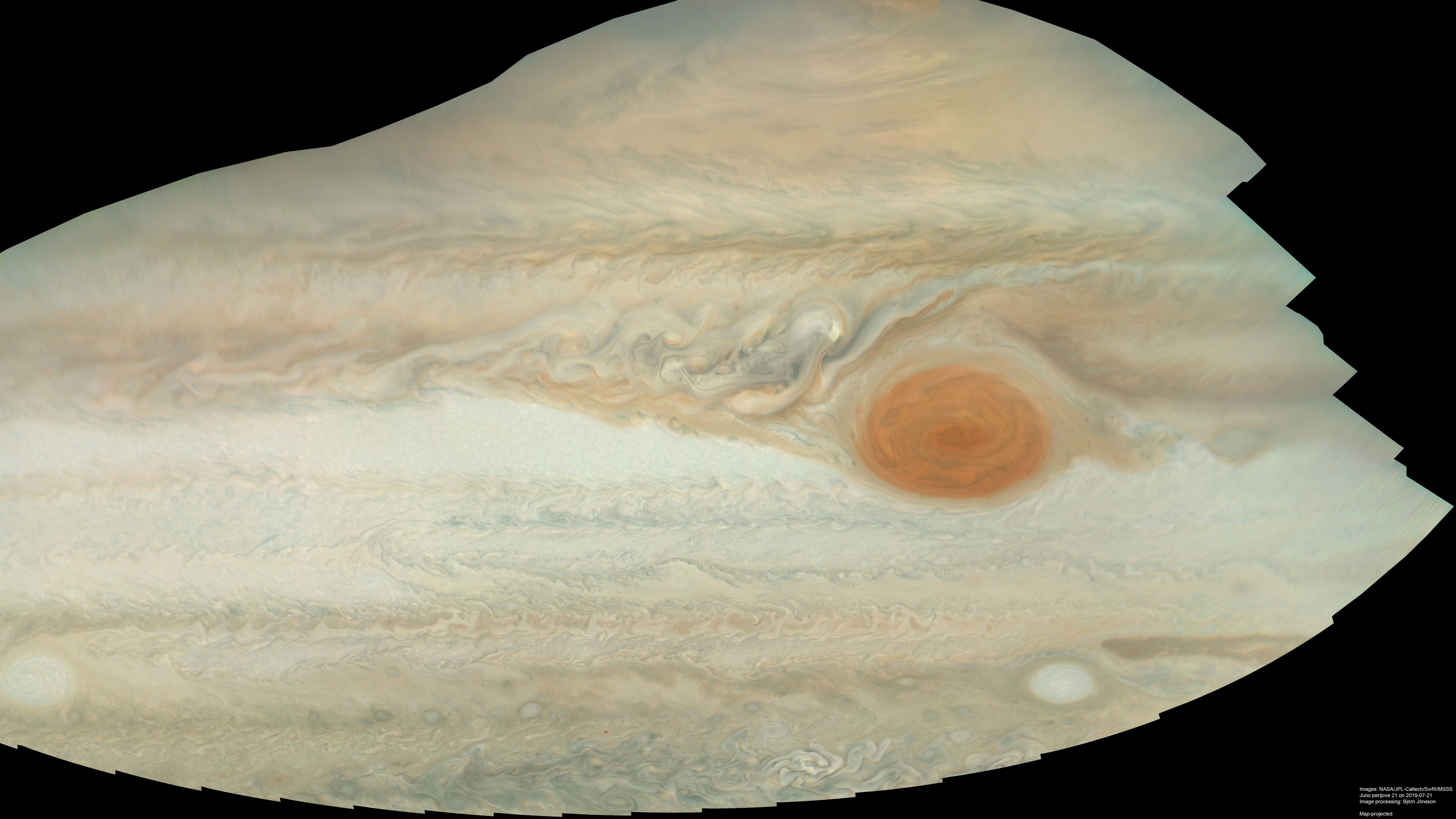 An approximately true color/contrast map-projected mosaic of six PJ21 images showing among other things the Great Red Spot and the STB Spectre. Areas near the left and right edges of the mosaic are near the limb in the original images. Therefore they appear rather fuzzy here and the color is probably inaccurate, at least near the right edge. These areas are nevertheless included since they include interesting features, especially in the areas east of the Great Red Spot.