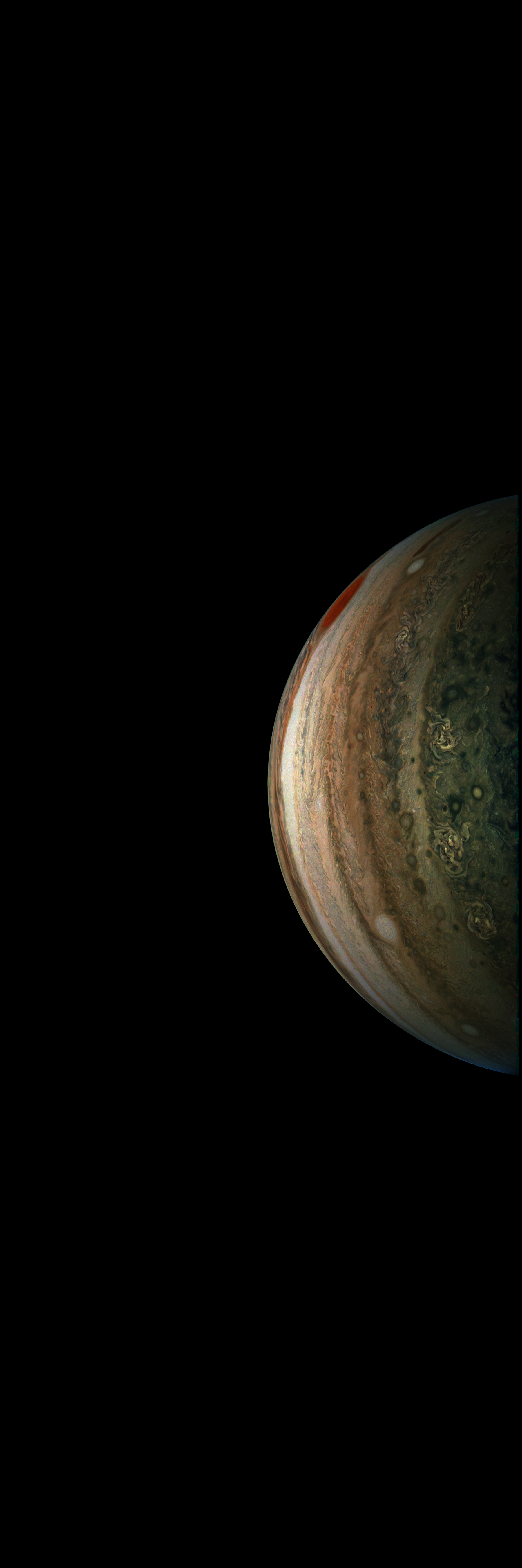 The image is reprojected according to a preliminary geometrical camera model, cleaned from most repetitive camera artifacts and from most energetic particle hits, approximately illumination adjusted on the basis of an illumination model derived from the Perijove 20 flyby, and stretched with gamma=4 with respect to radiometric values. Resolution is 30 pixels per degrees in an equidistant cylindrical system centered to the camera at image stop time, with an axis parallel to Juno's spin axis. The rendered field of view is 60x180 degrees.