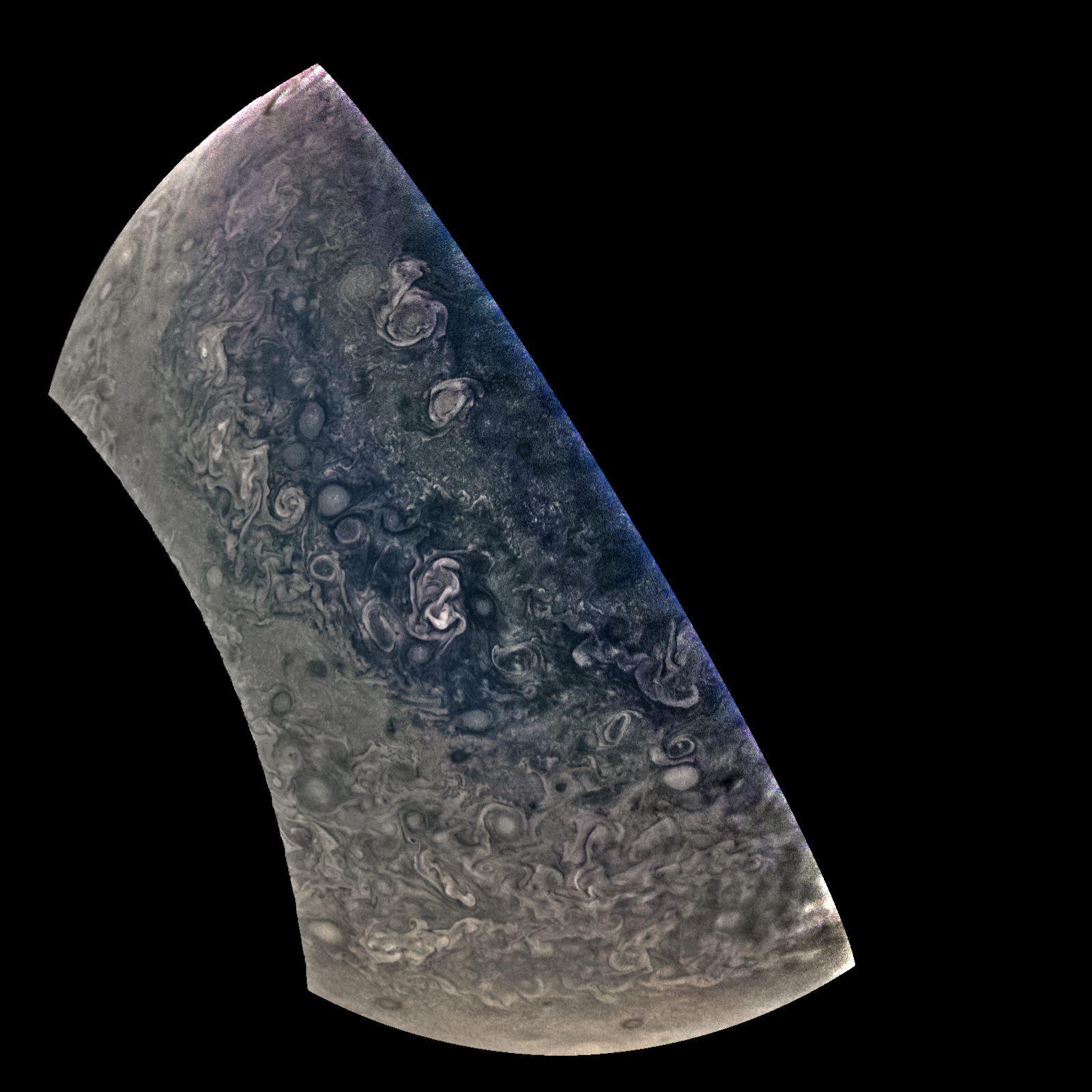 Junocam pixels are 12 bits deep from the camera but are converted to 8 bits inside the instrument using a lossless "companding" table, a process similar to gamma correction, to reduce their size. All Junocam products on the missionjuno website are in this 8-bit form as received on Earth. Scientific users interested in radiometric analysis should use the "RDR" data products archived with the Planetary Data System, which have been converted back to a linear 12-bit scale.