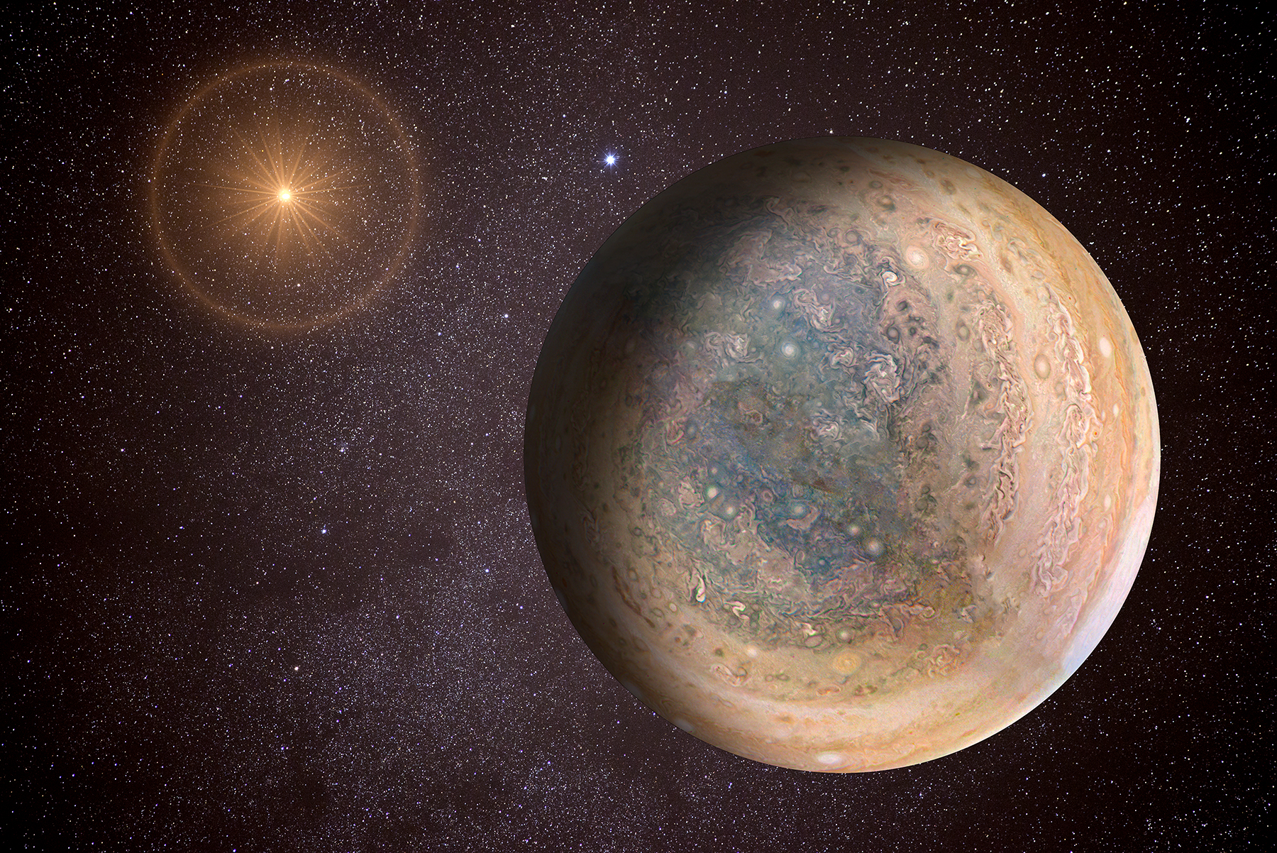 We all see images of Jupiter. Close ups, partials, and all encompassing vantage points of the gas planet. To put it in better persepective, I prefer to layer these views on my star images to show what the planet would actually look like, floating out there. I married together two hemispheres, albeit not an accurate depiction of both as it would be.