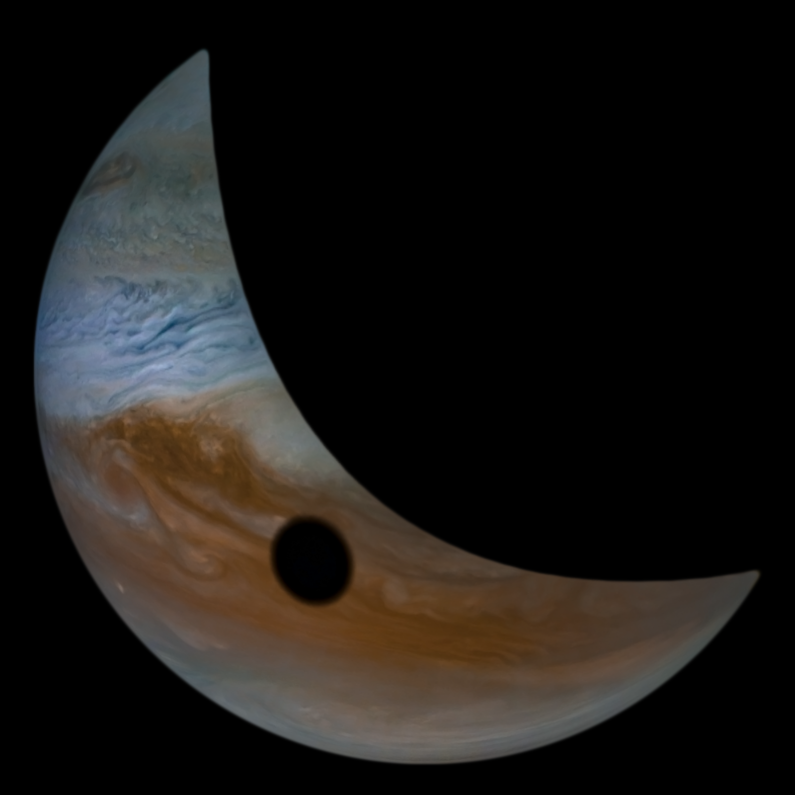 Processed using the JunoCam imager's PJ22 JET N1 and Io Shadow raw images and data from NASA's Juno spacecraft flyby on September 12, 2019. Enhanced to highlight features, clouds, colours, and the beauty of Jupiter. Artist's impression - not representative of true colour.
